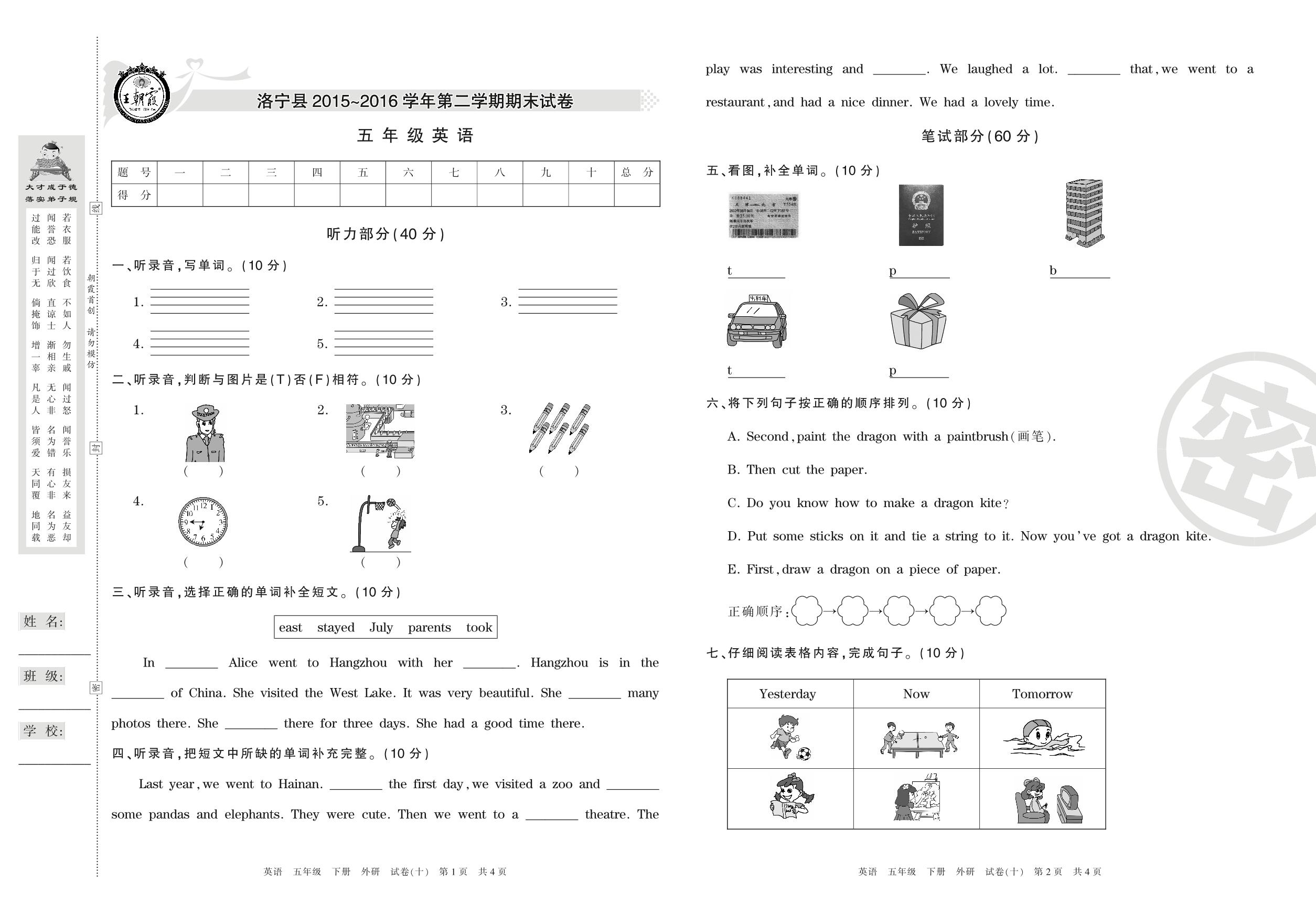 2015-2016学年第二学期洛阳市洛宁县五年级英语试卷(外研版)【10】