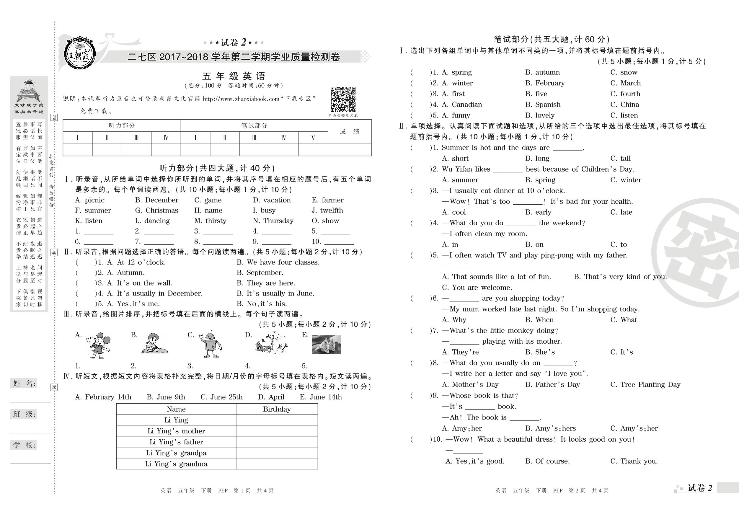 2017-2018学年第二学期郑州市二七区五年级英语试卷(PEP版)【2】