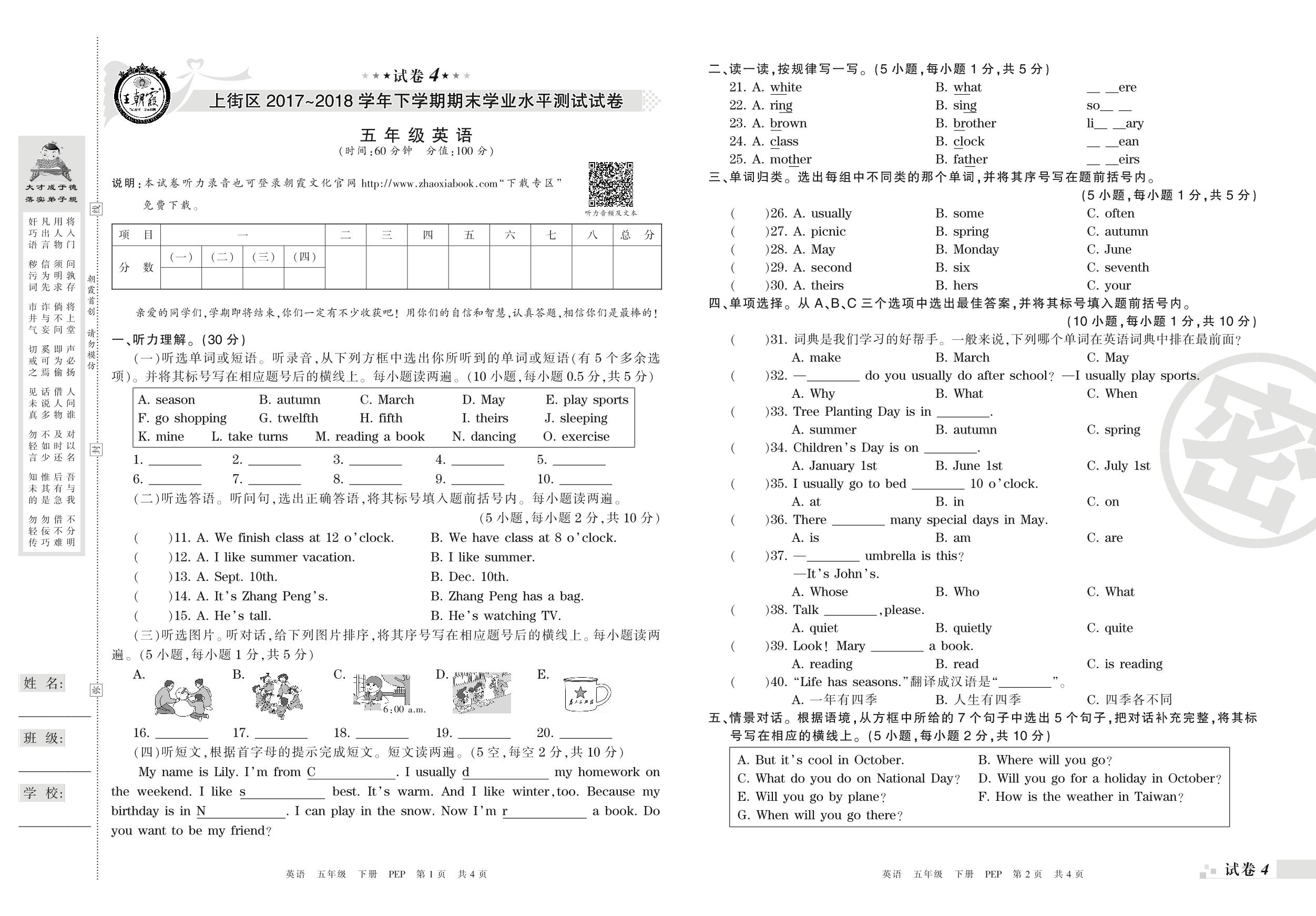 2017-2018学年第二学期郑州市上街区五年级英语试卷(PEP版)【4】