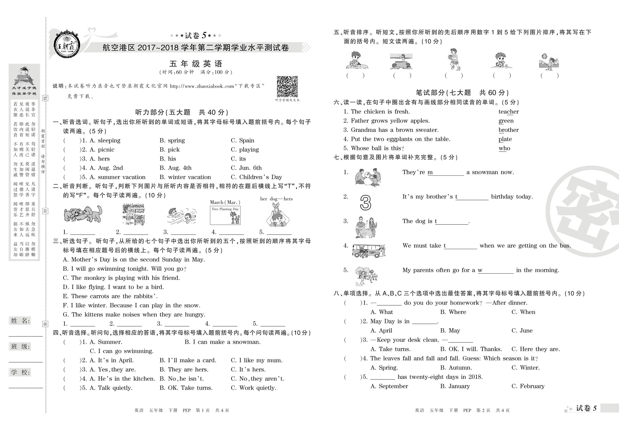 2017-2018学年第二学期郑州市航空港区五年级英语试卷(PEP版)【5】