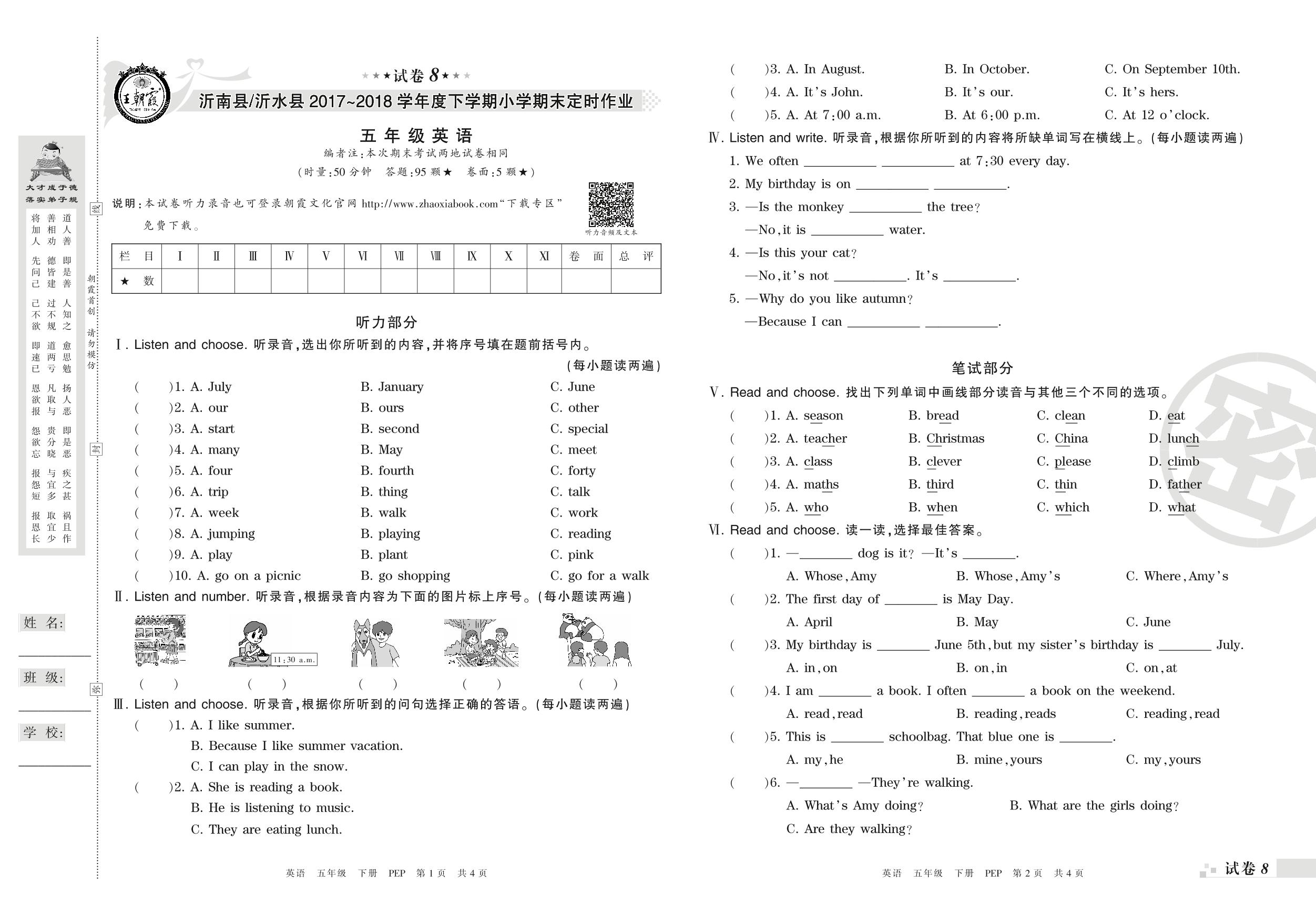 2017-2018学年第二学期临沂市沂南县、沂水县五年级英语试卷(PEP版)【8】