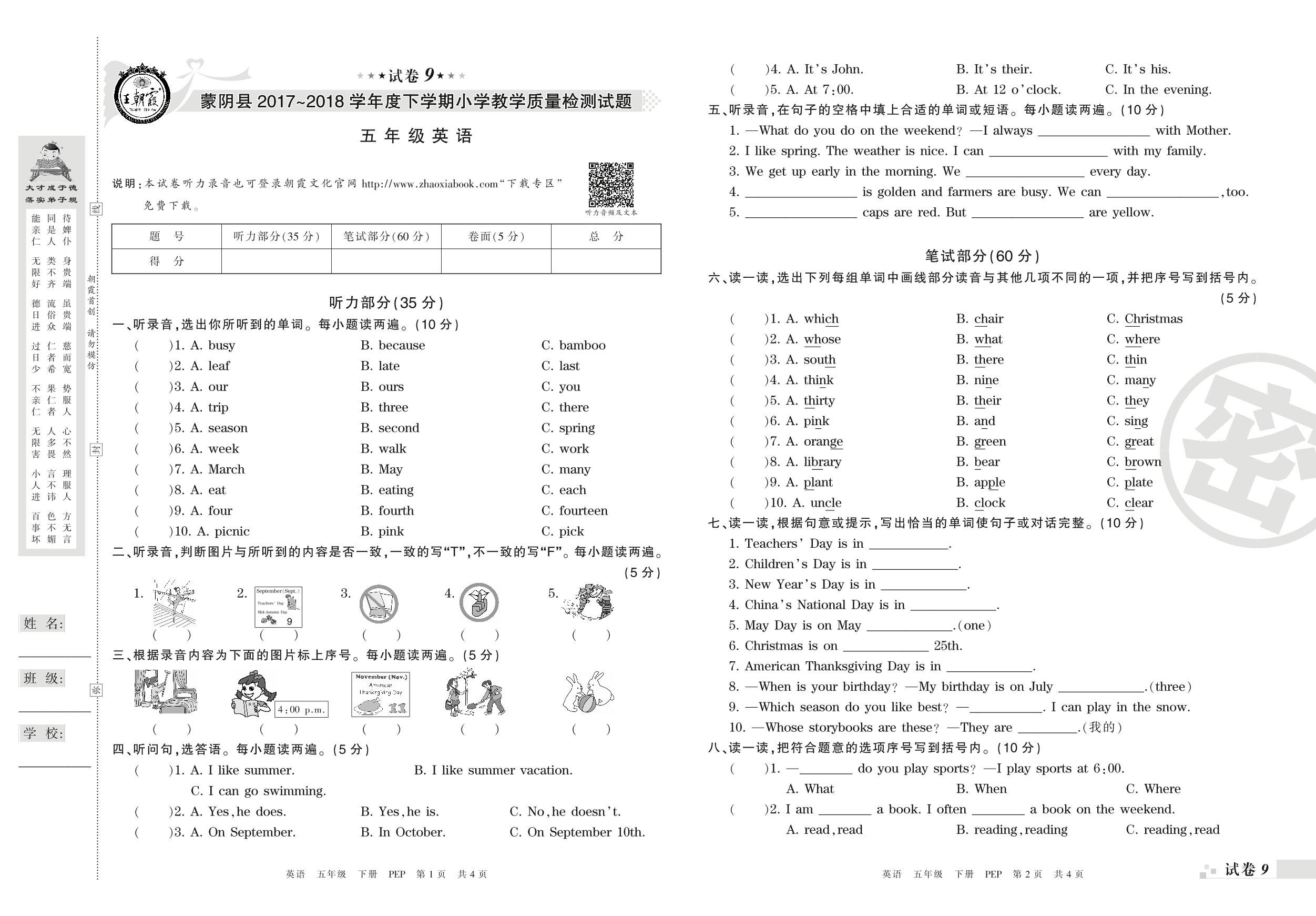 2017-2018学年第二学期临沂市蒙阴县五年级英语试卷(PEP版)【9】