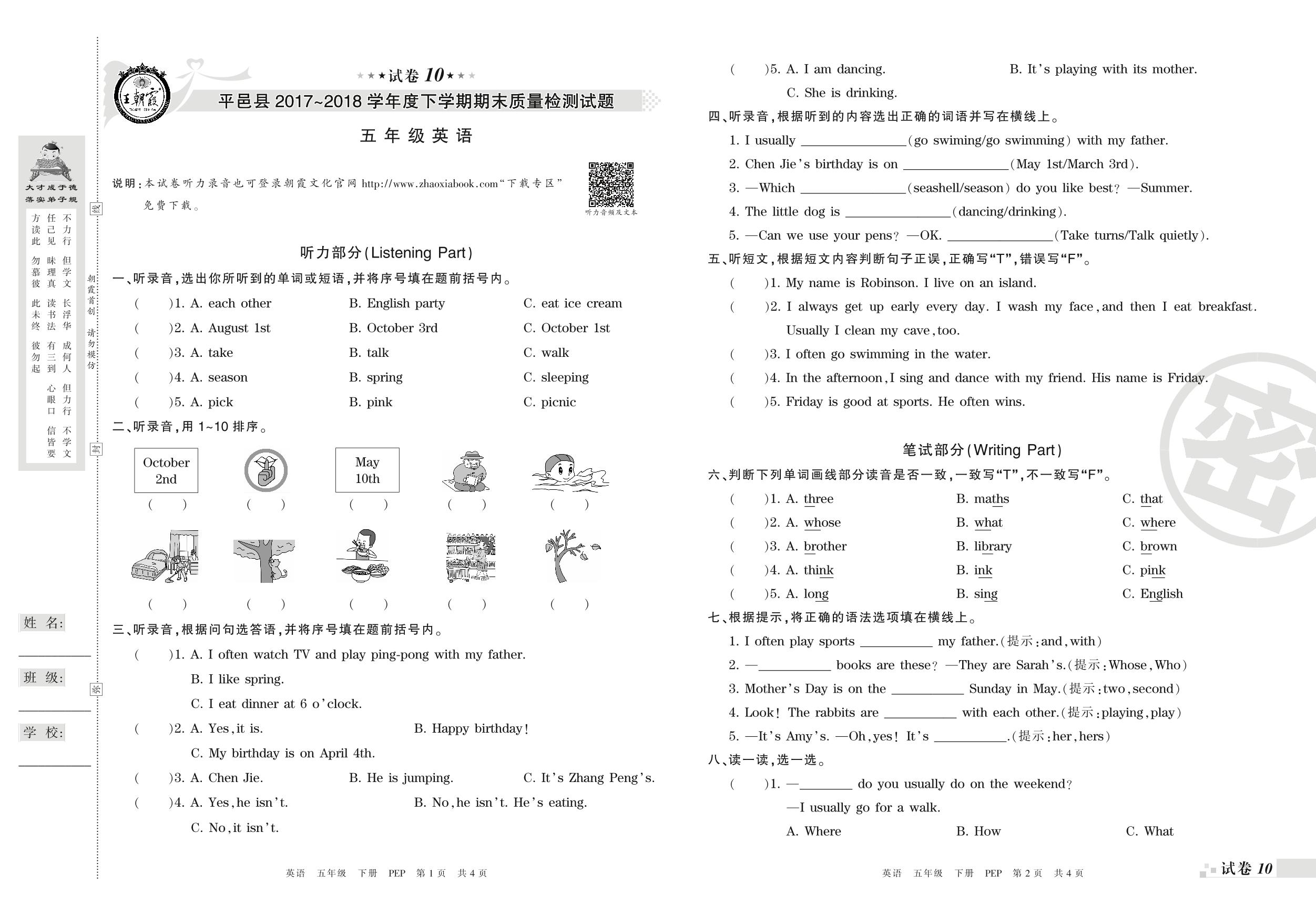 2017-2018学年第二学期临沂市平邑县五年级英语试卷(PEP版)【10】