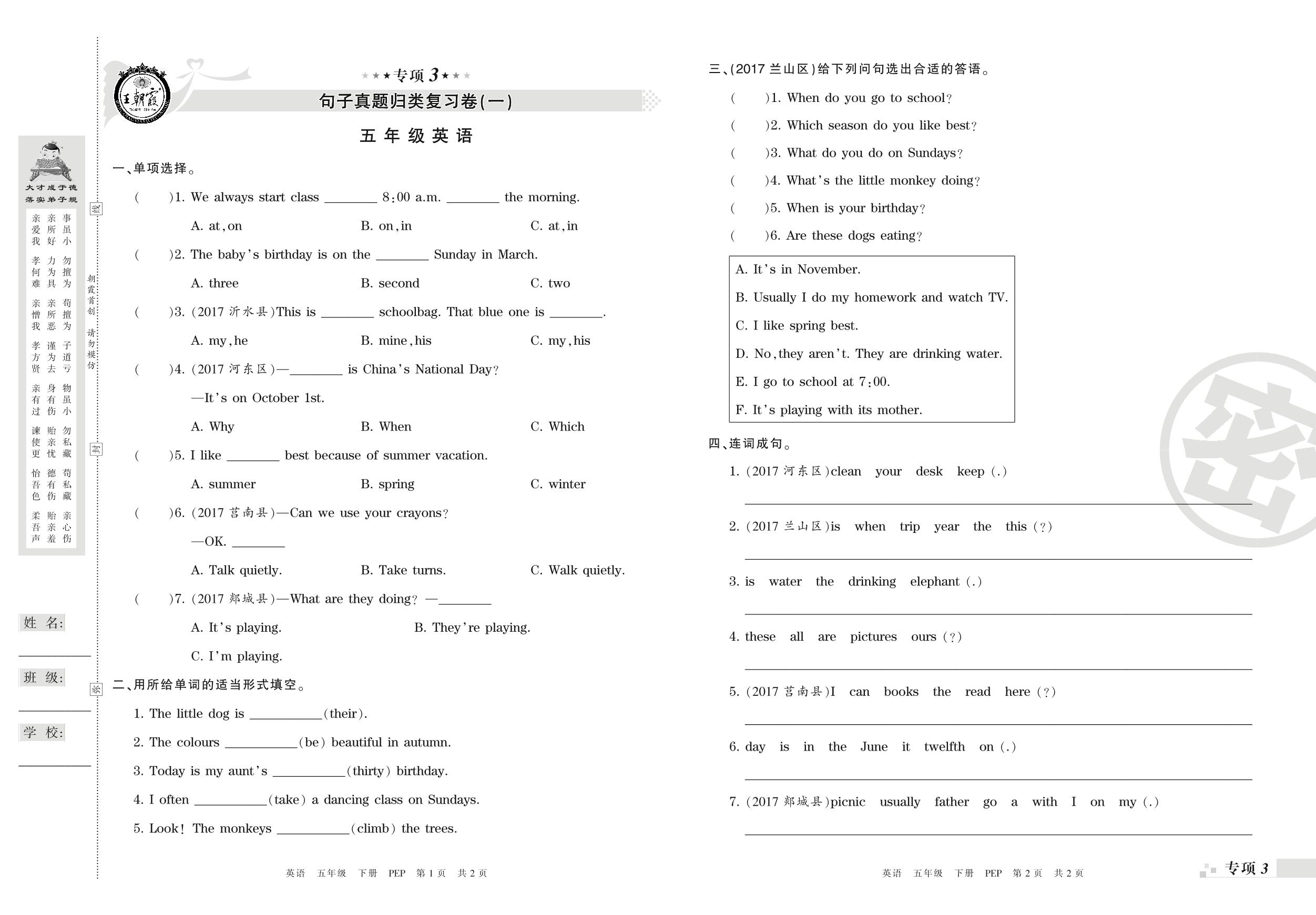 五年级英语人教PEP版(三起始)下册专项卷