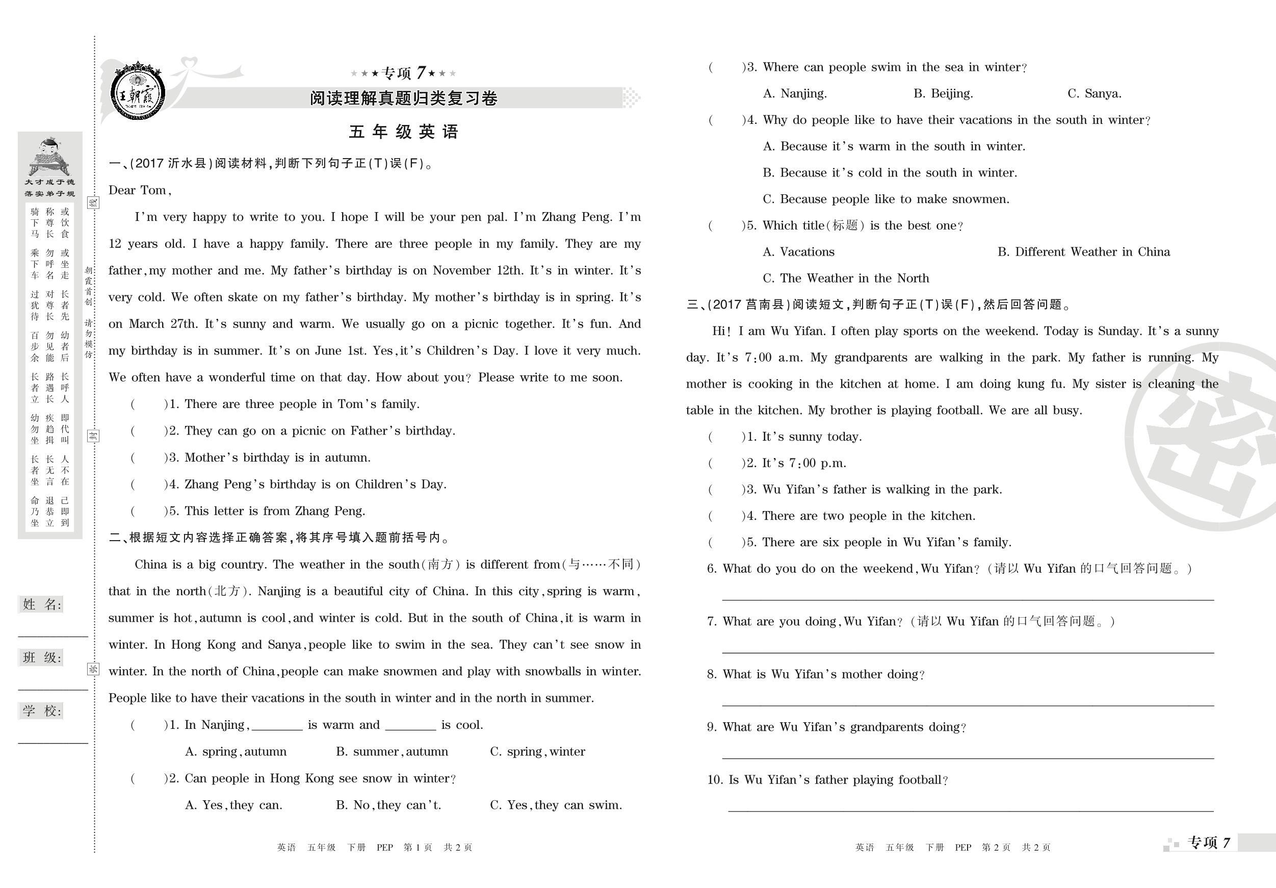 王朝霞期末专项卷——阅读理解、写作真题归类复习卷五年级下册英语(PEP版)_R210807145823【0】