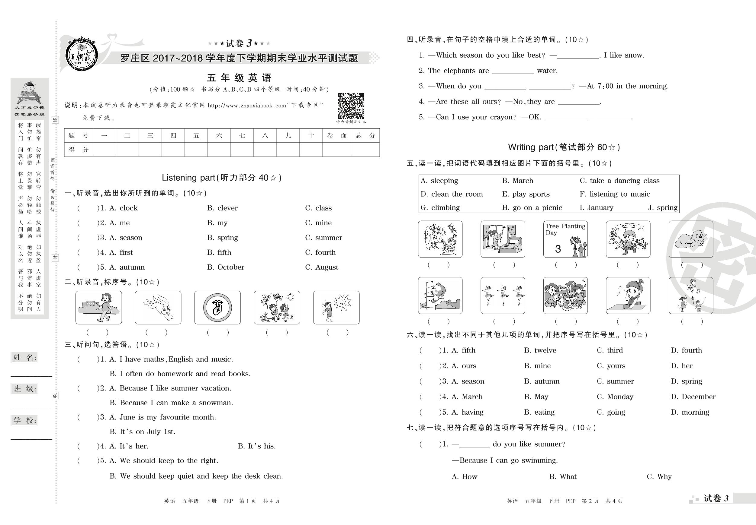 2017-2018学年第二学期临沂市罗庄区五年级英语试卷(PEP版)【3】
