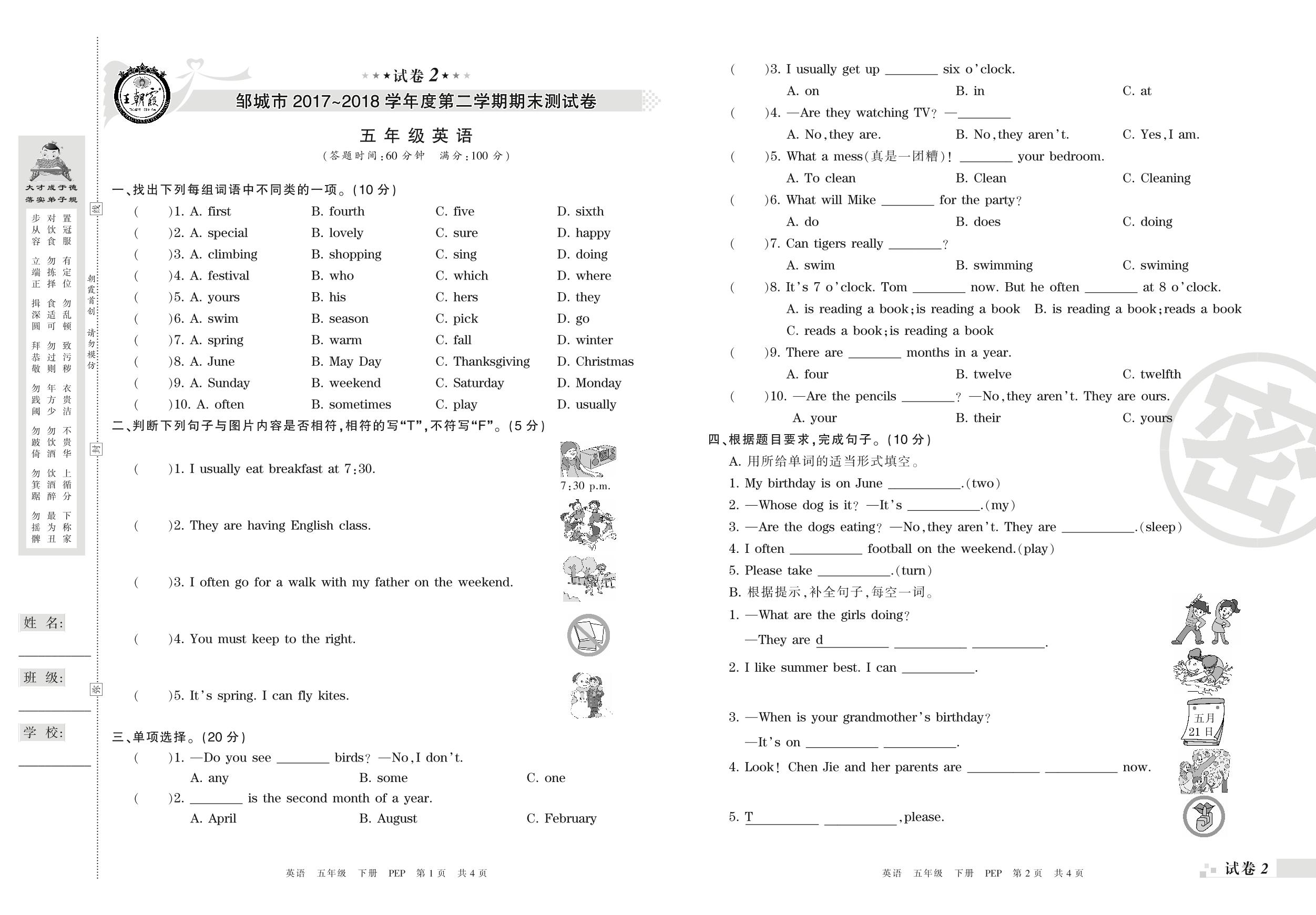 2017-2018学年第二学期邹城市五年级英语试卷(PEP版)【2】