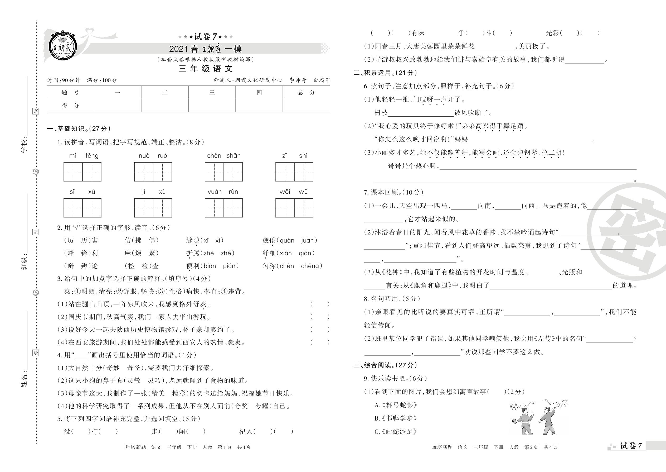 王朝霞期末模拟卷三年级下册语文(人教版)_R21080183016【7】