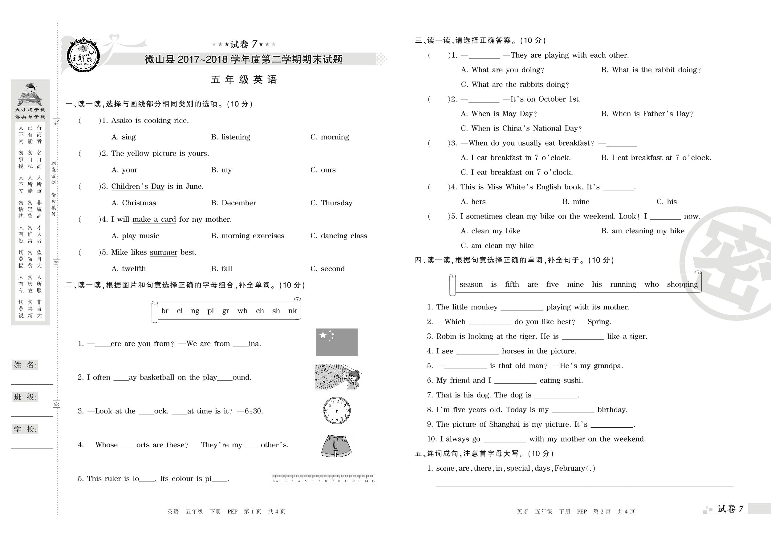 2017-2018学年第二学期济宁市微山县五年级英语试卷(PEP版)【7】