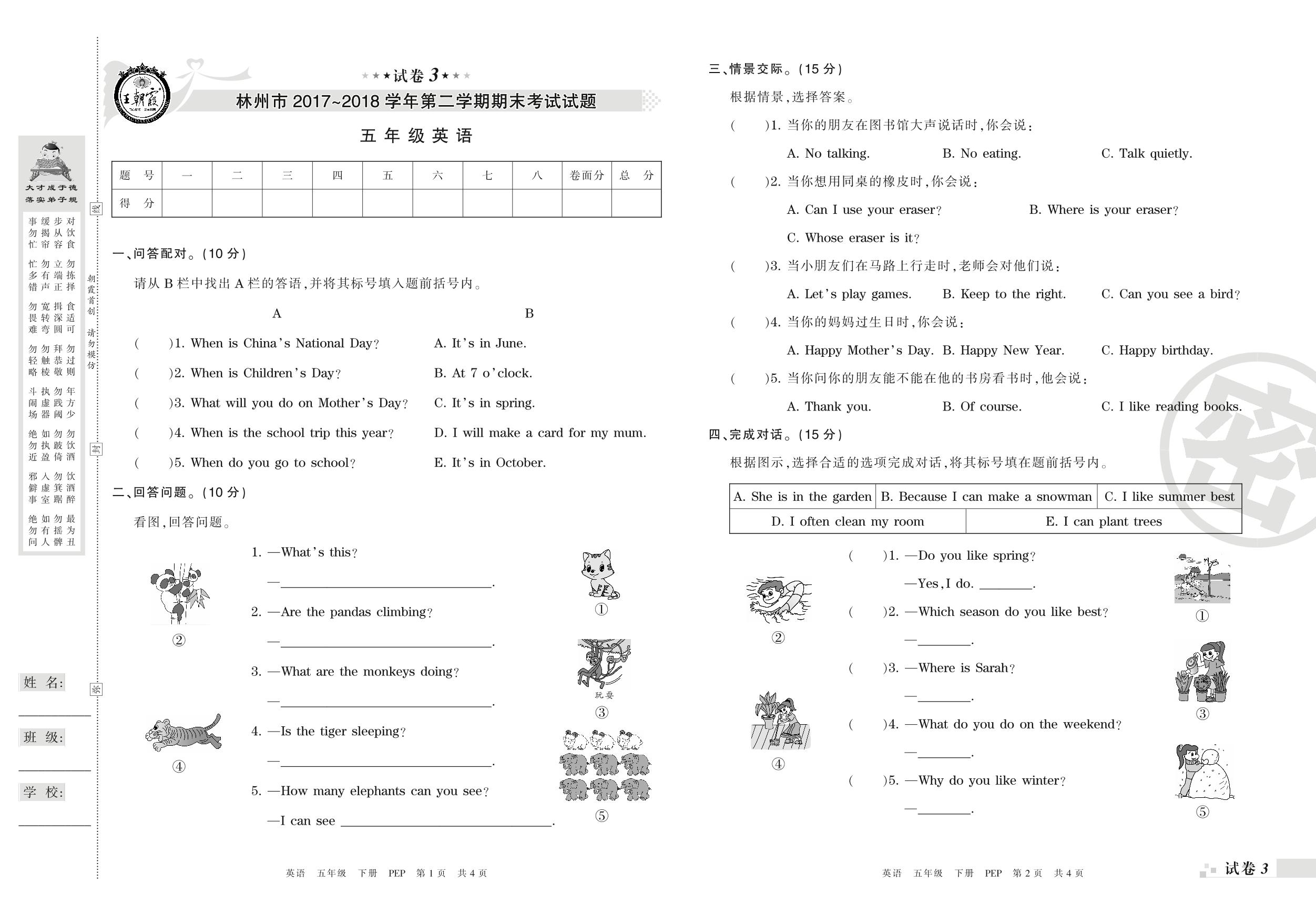 2017-2018学年第二学期林州市五年级英语试卷(PEP版)【3】