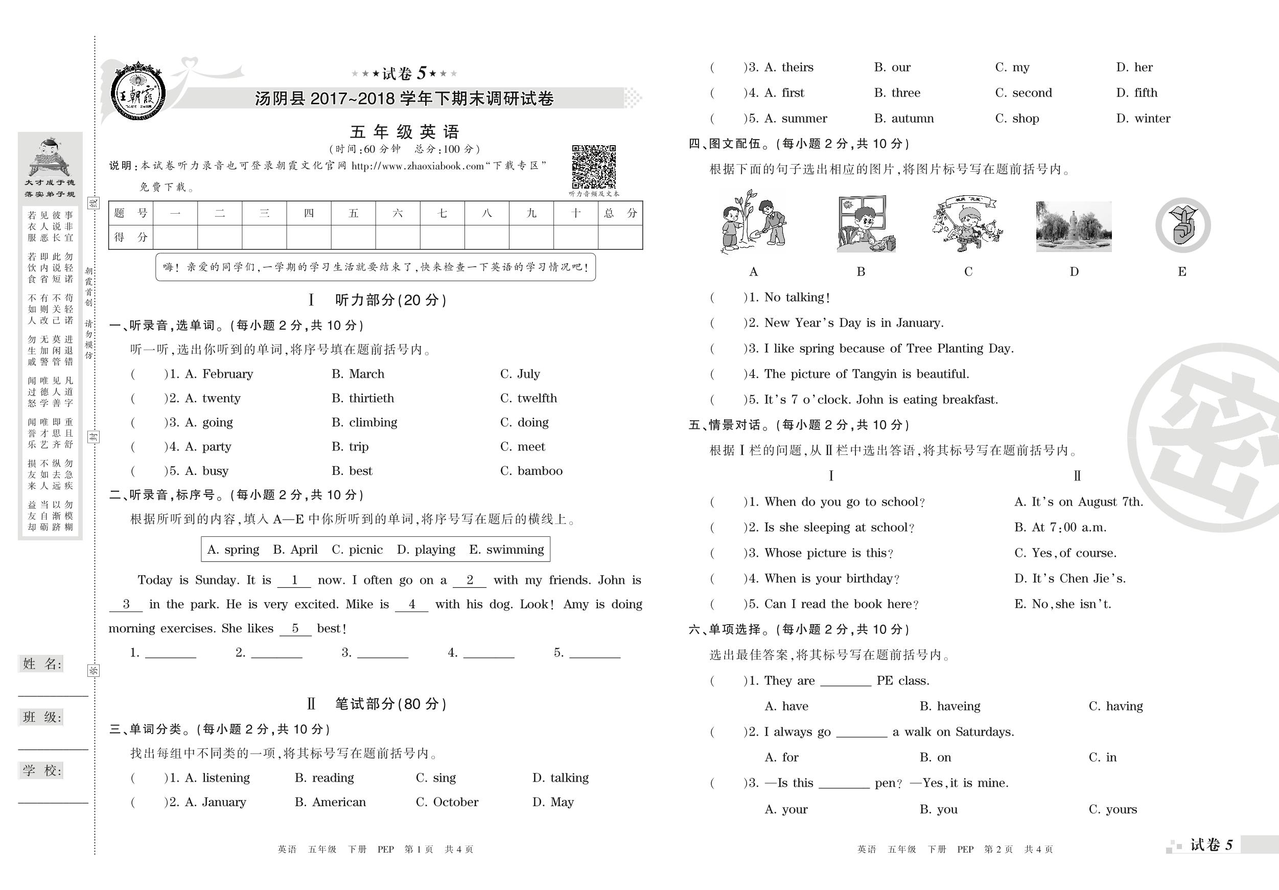2017-2018学年第二学期安阳市汤阴县五年级英语试卷(PEP版)【5】