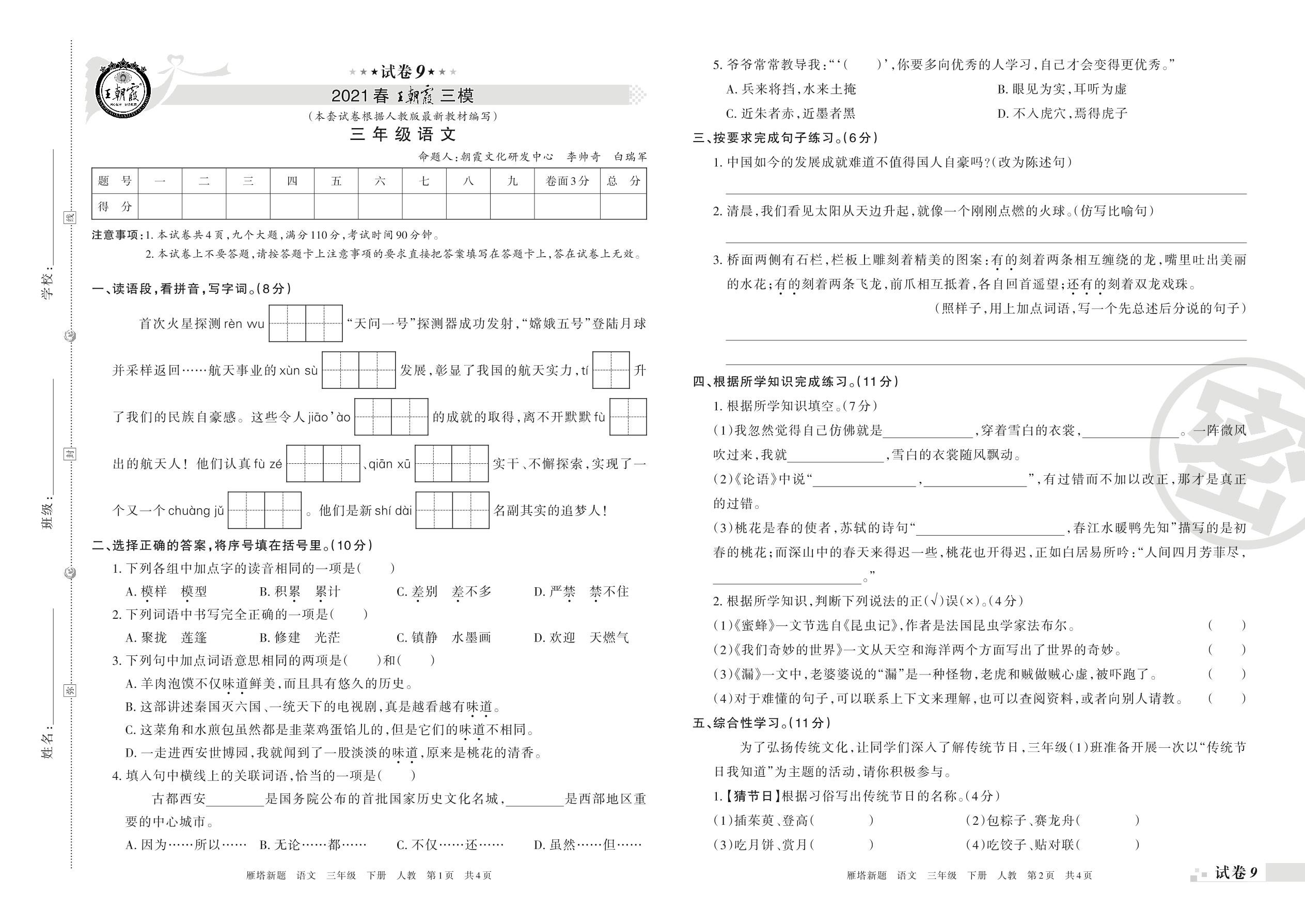 王朝霞期末模拟卷三年级下册语文(人教版)_R21080183023【9】