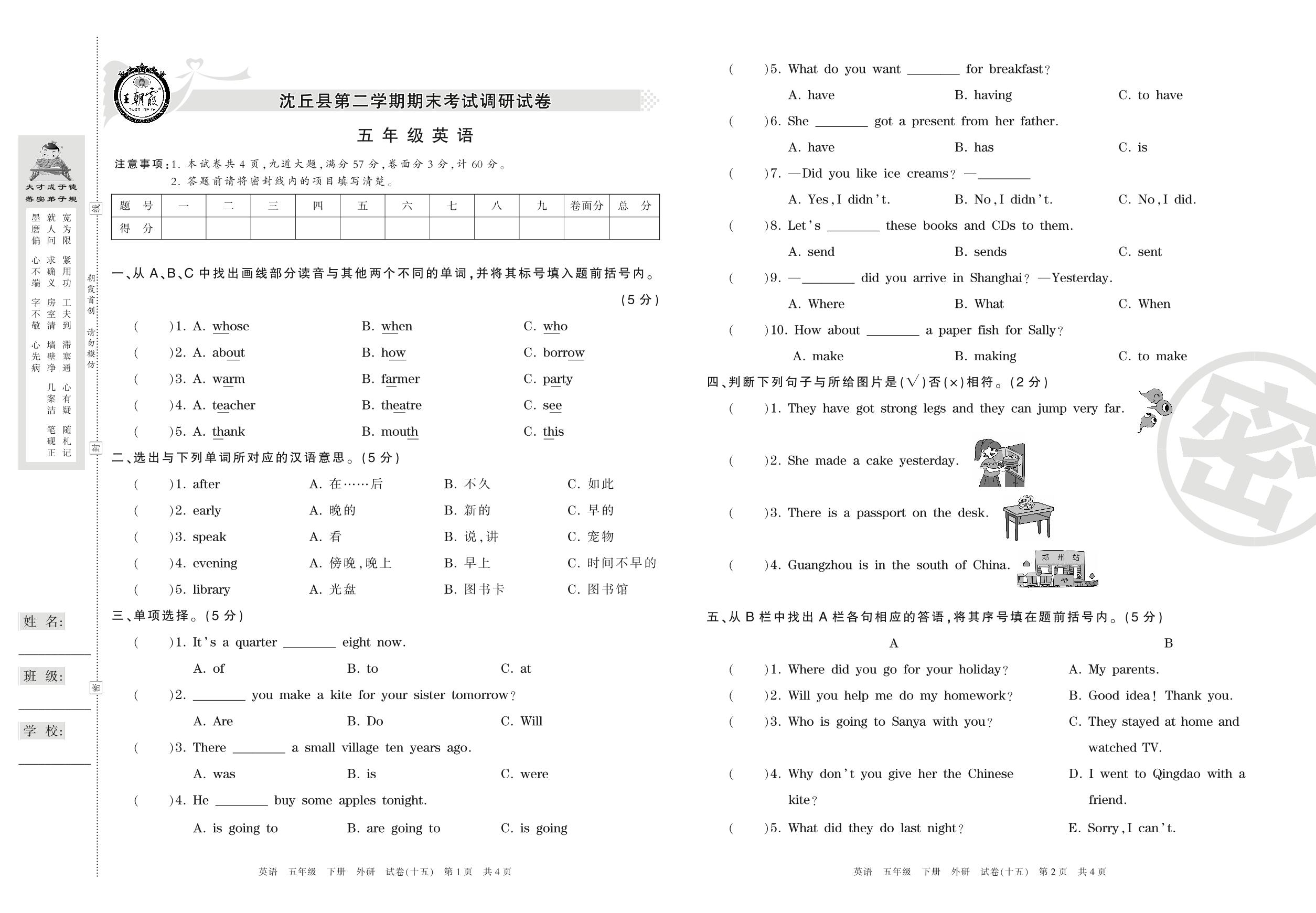 2015-2016学年第二学期周口市沈丘县五年级英语试卷(外研版)【15】
