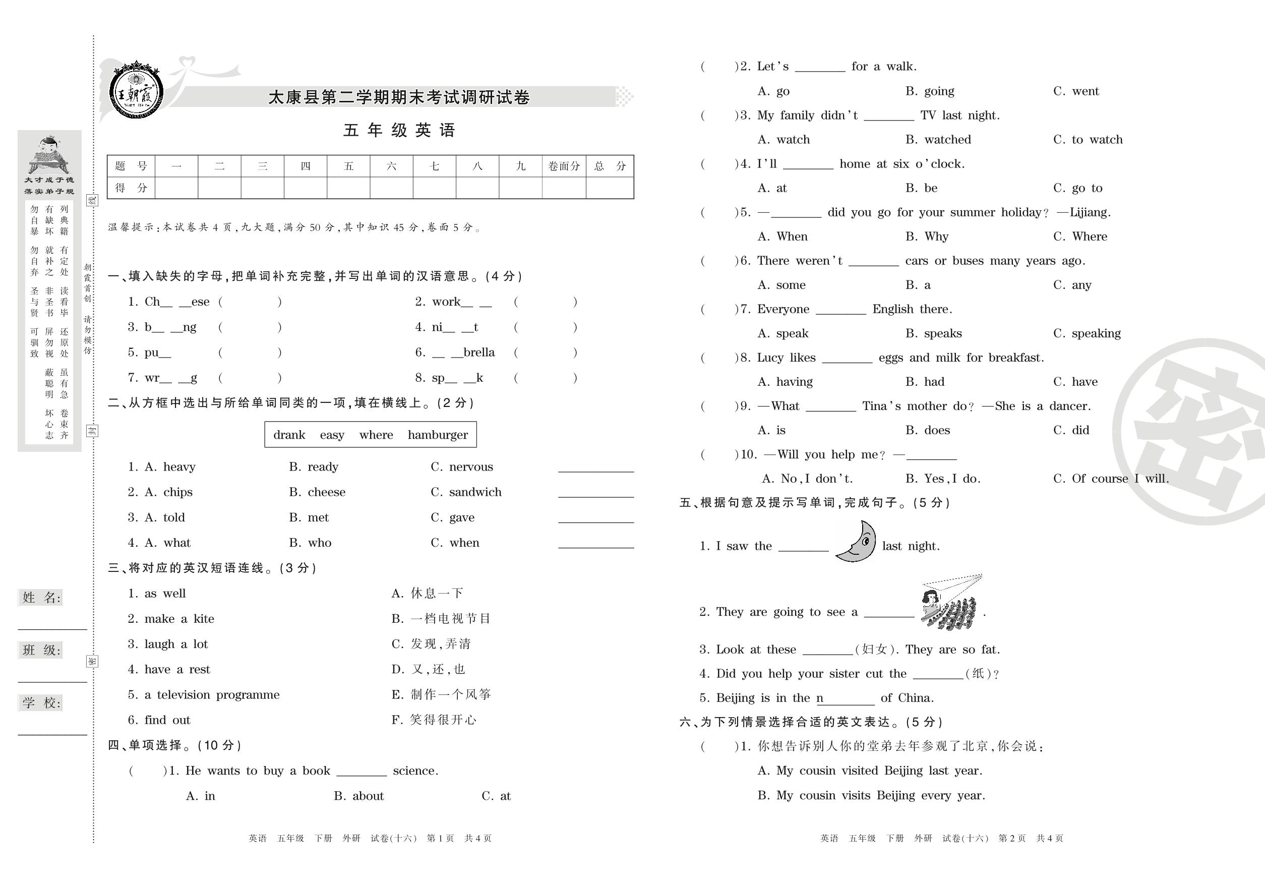 五年级英语外研版(三起始)下册期末卷