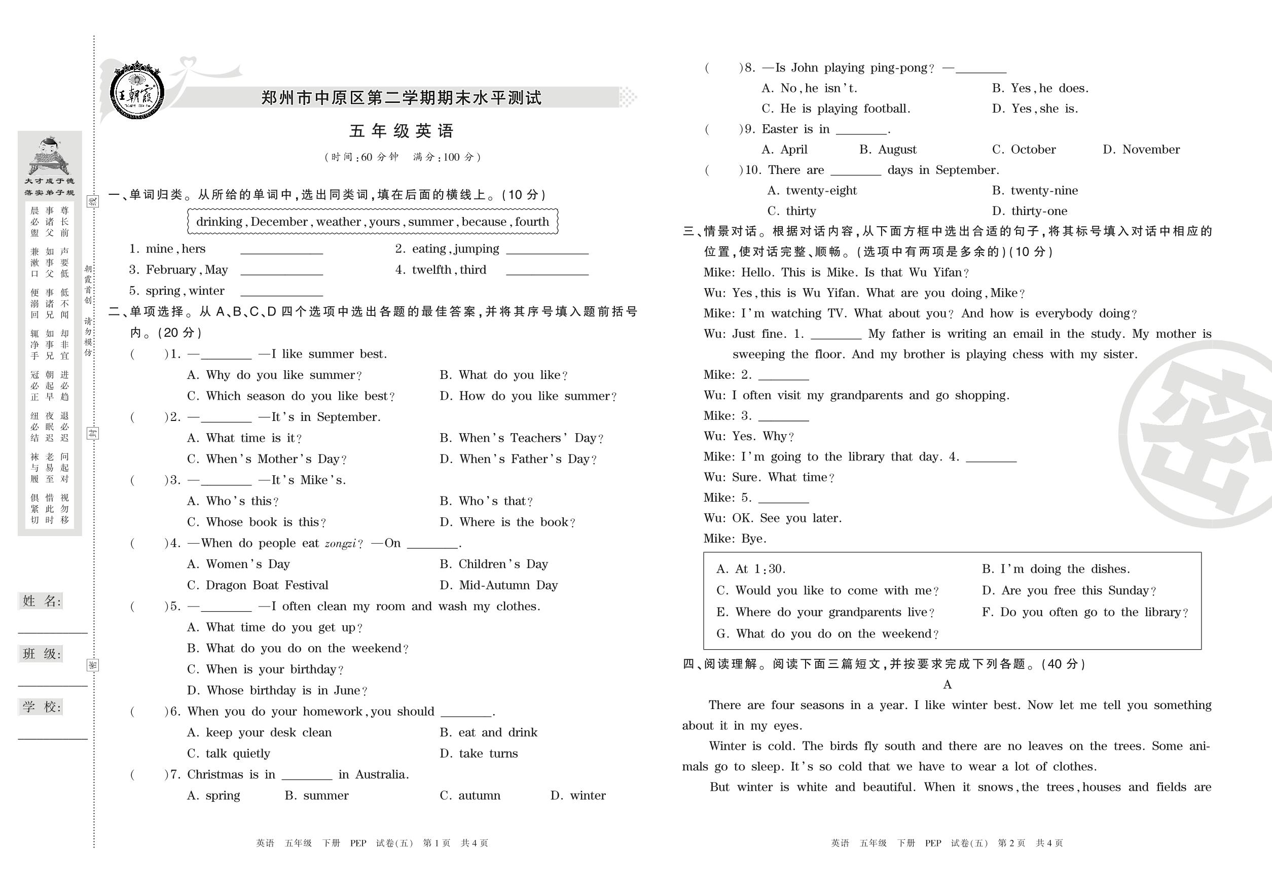 2015-2016学年第二学期郑州市中原区五年级英语试卷(PEP版)【5】