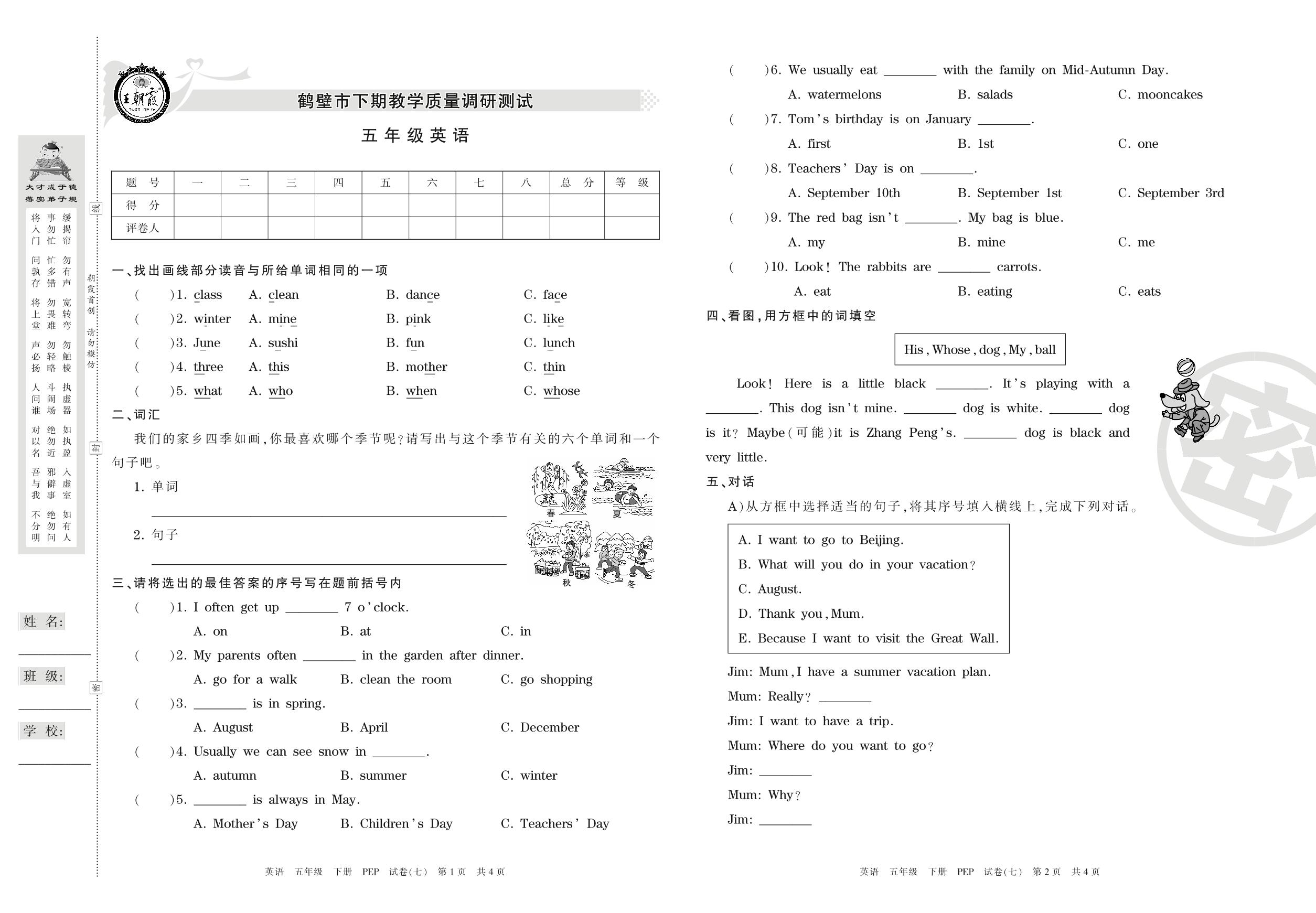 2015-2016学年第二学期鹤壁市五年级英语试卷(PEP版)【7】