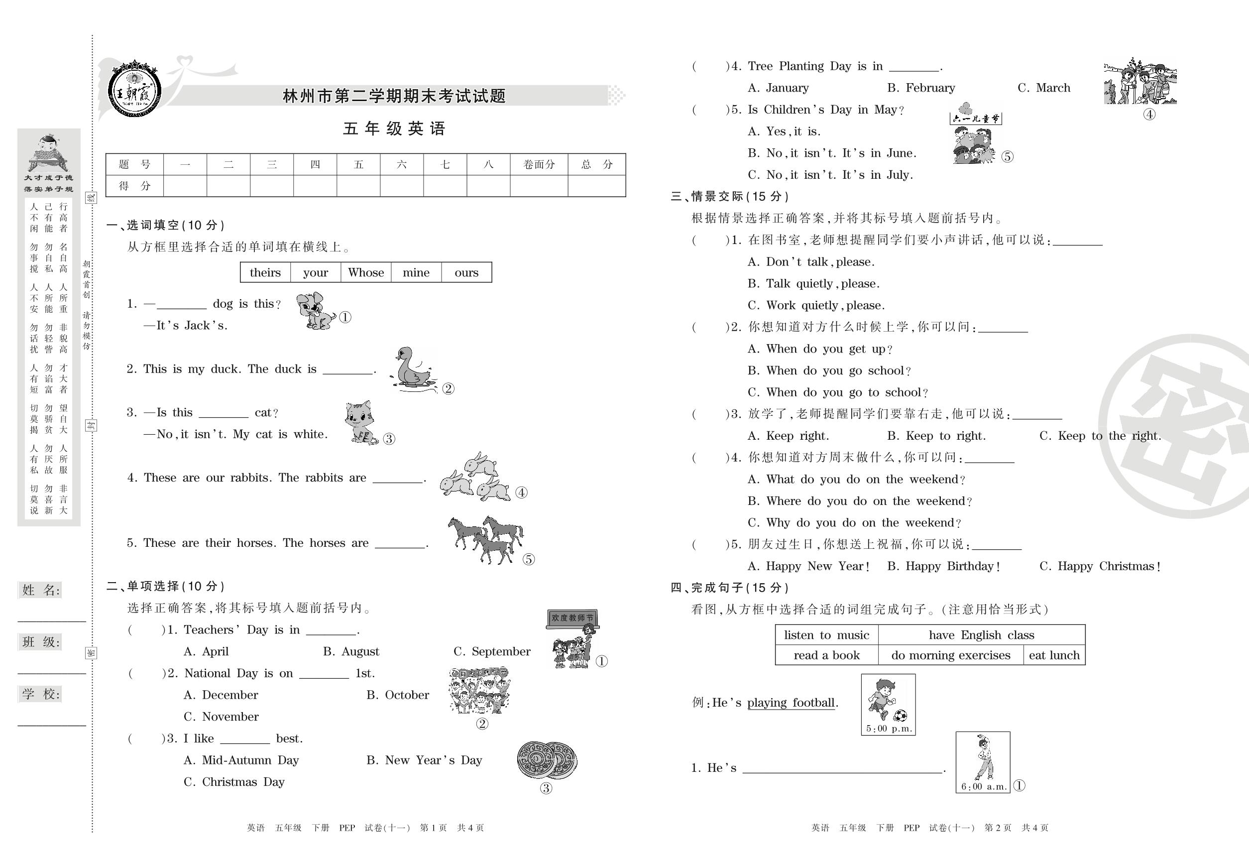 2015-2016学年第二学期林州市五年级英语试卷(PEP版)【11】