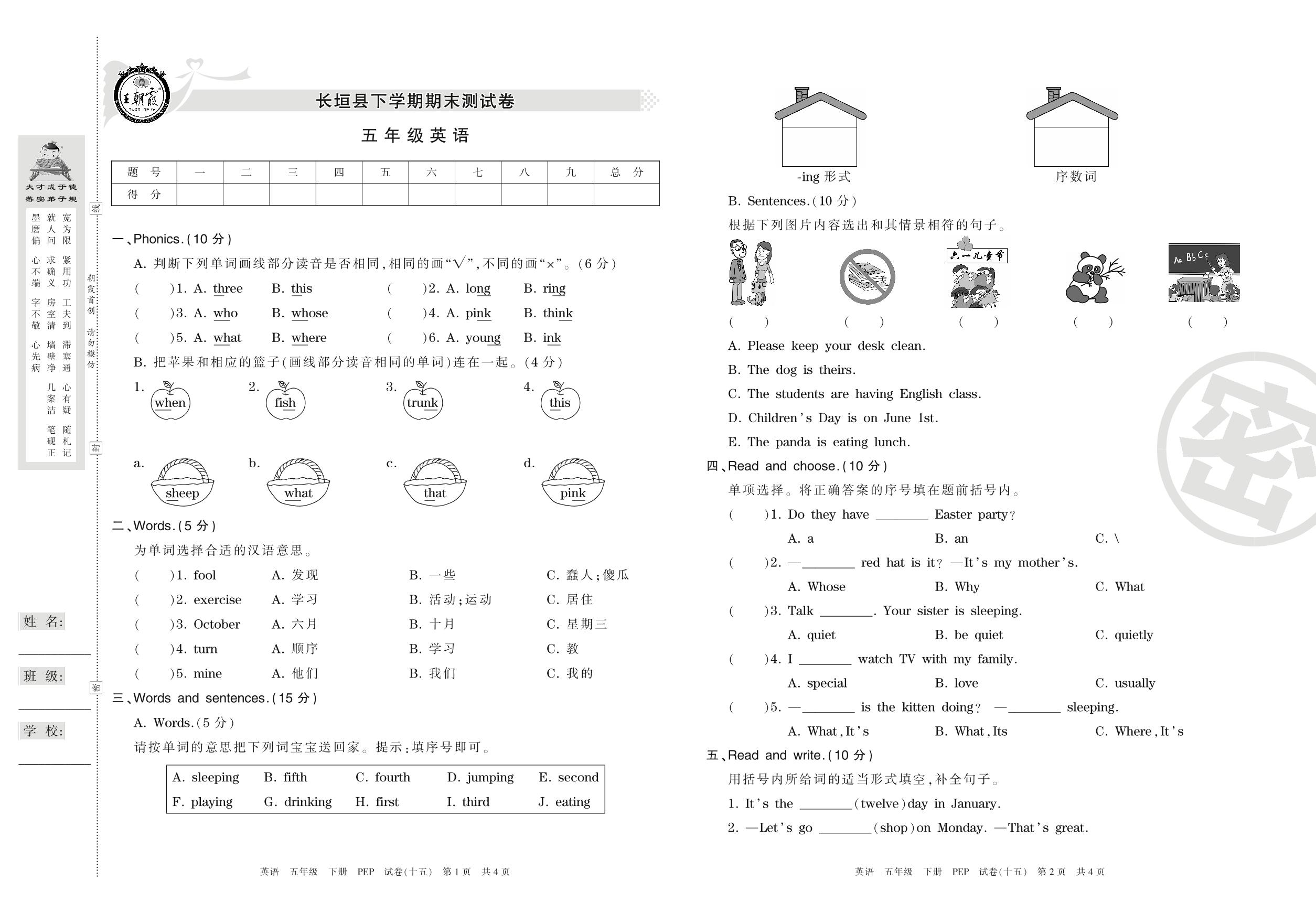 五年级英语人教PEP版(三起始)下册期末卷