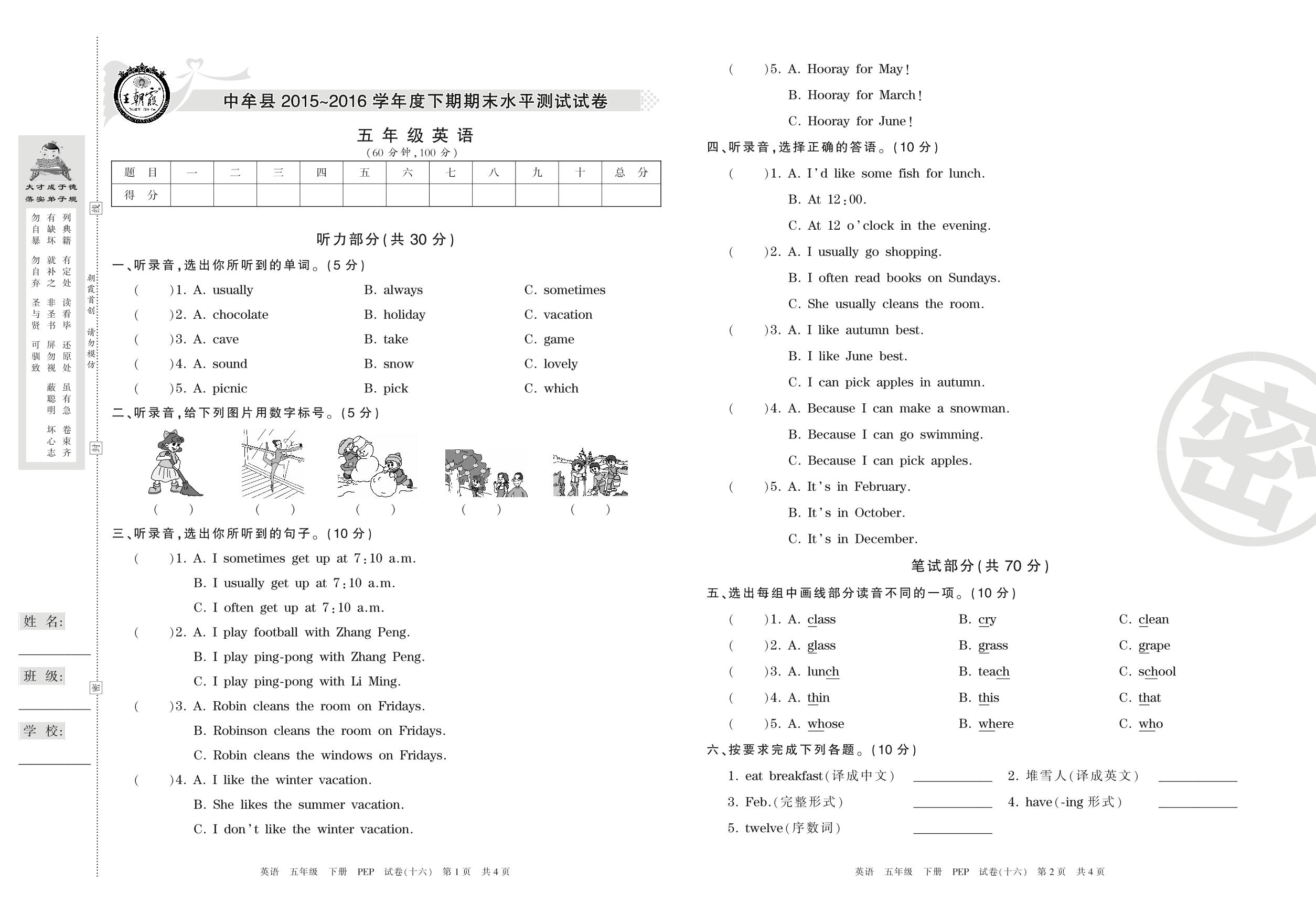 2015-2016学年第二学期郑州市中牟县五年级英语试卷(PEP版)【16】