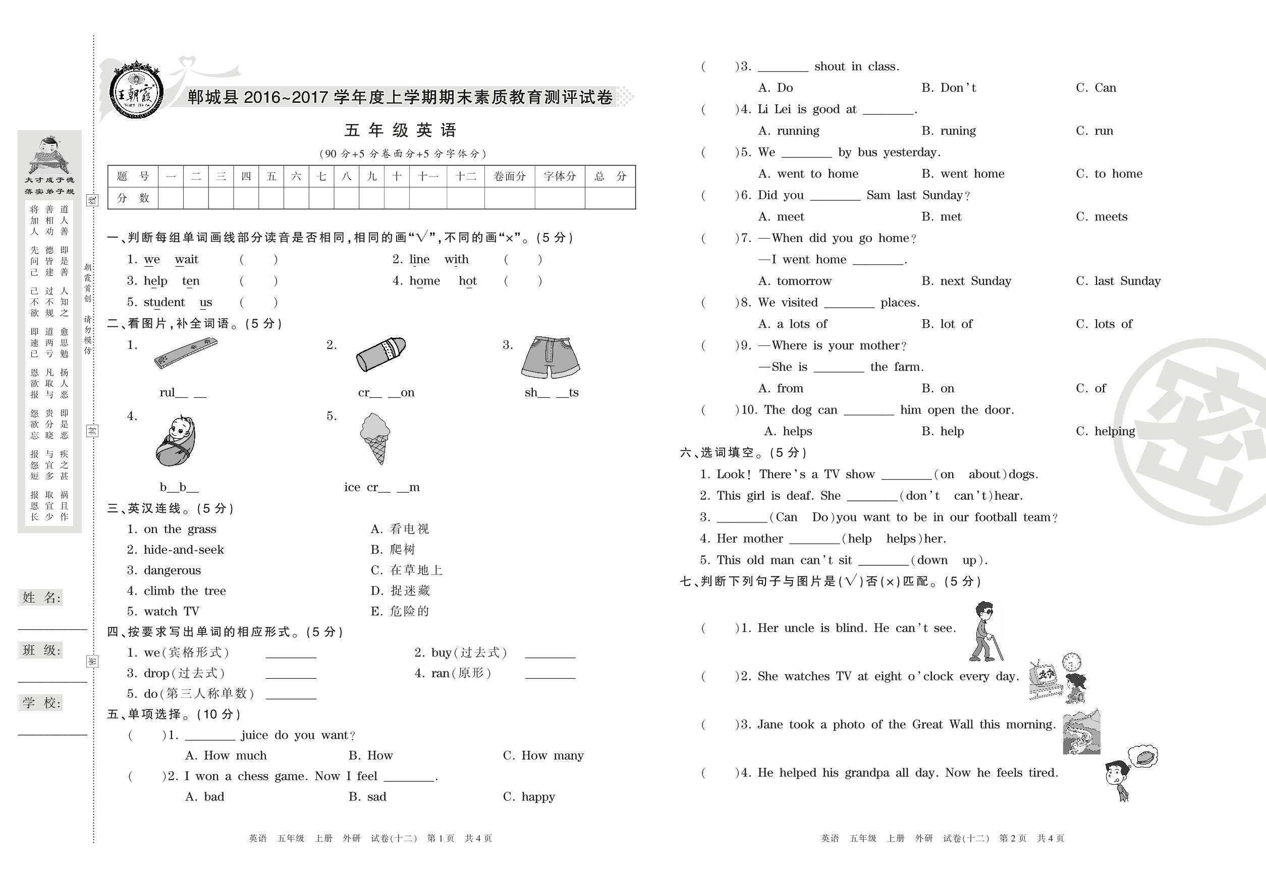 2016-2017学年第一学期周口市郸城县五年级英语试卷(外研版)【12】