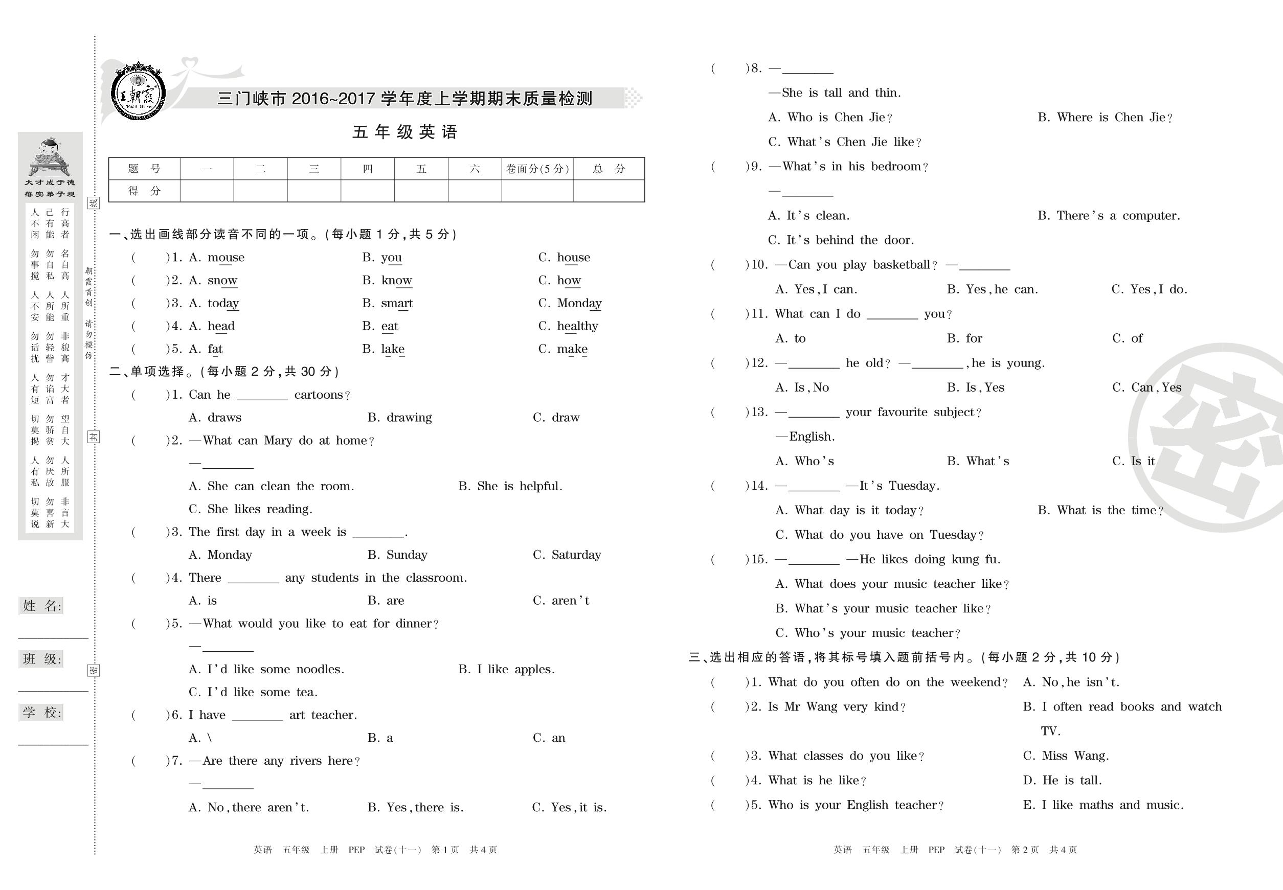 2016-2017学年第一学期三门峡市五年级英语试卷(PEP版)【11】