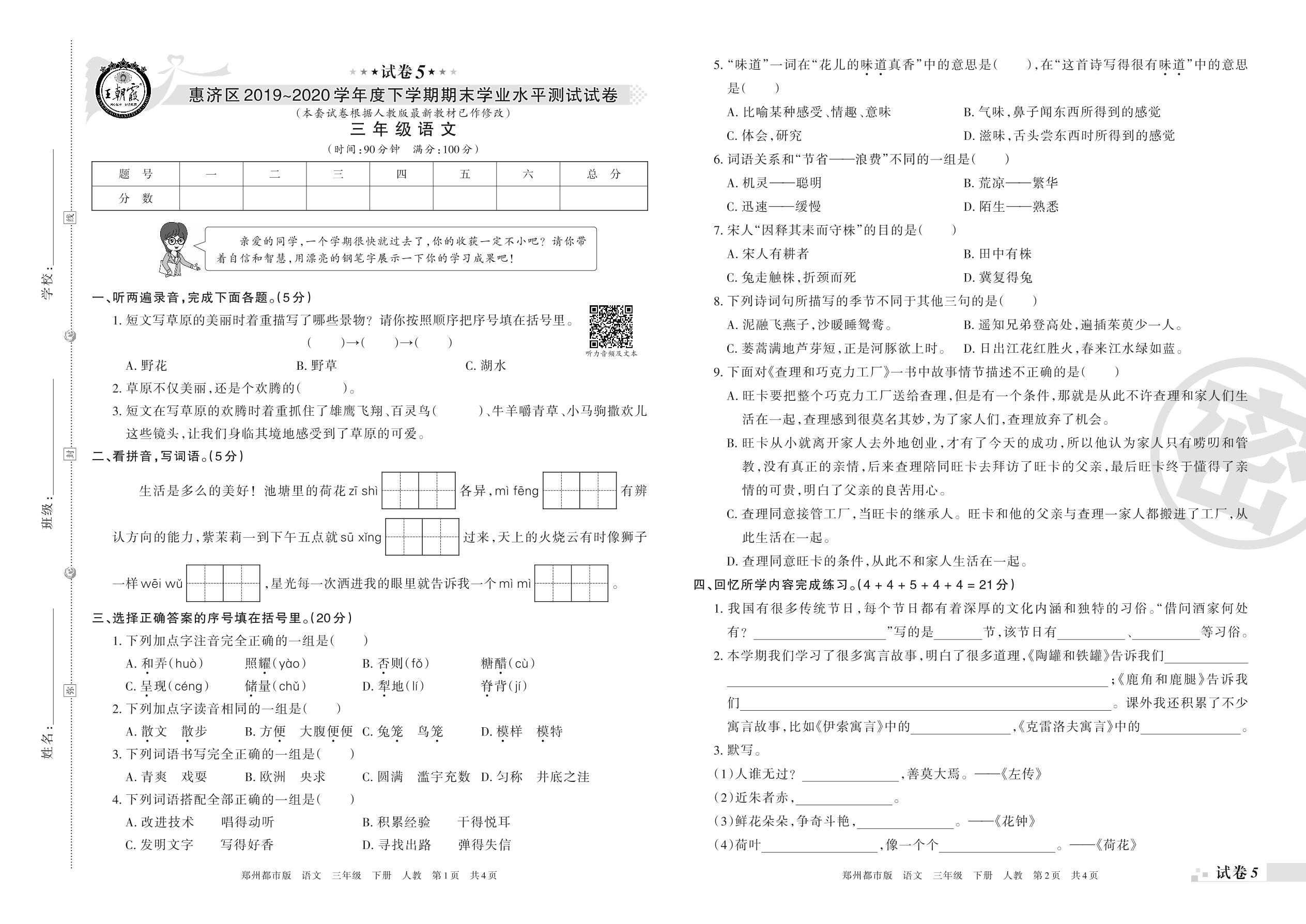 2019-2020学年第二学期郑州市惠济区三年级语文试卷(人教版)【5】