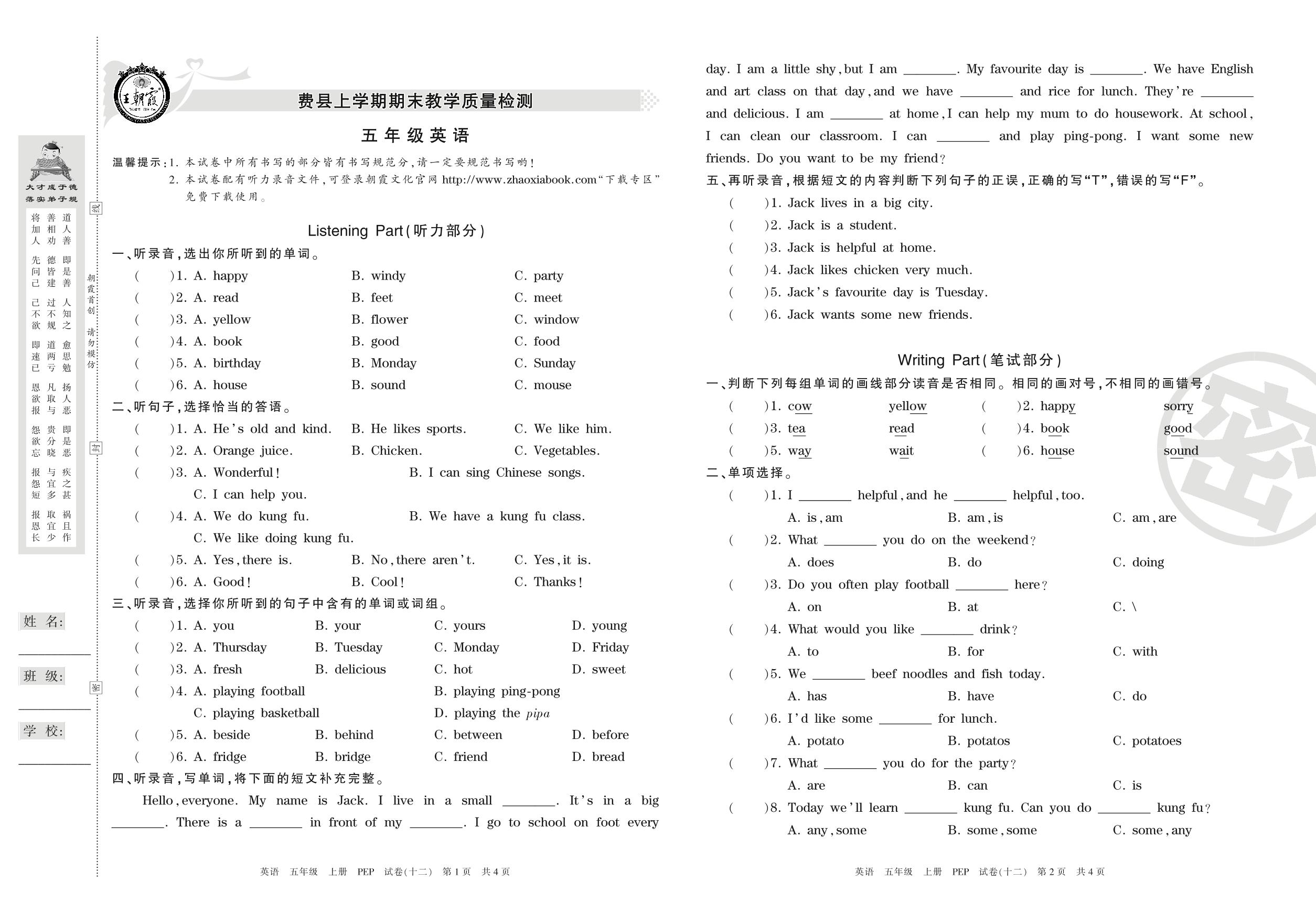 2016-2017学年第一学期临沂市费县五年级英语试卷(PEP版)【12】