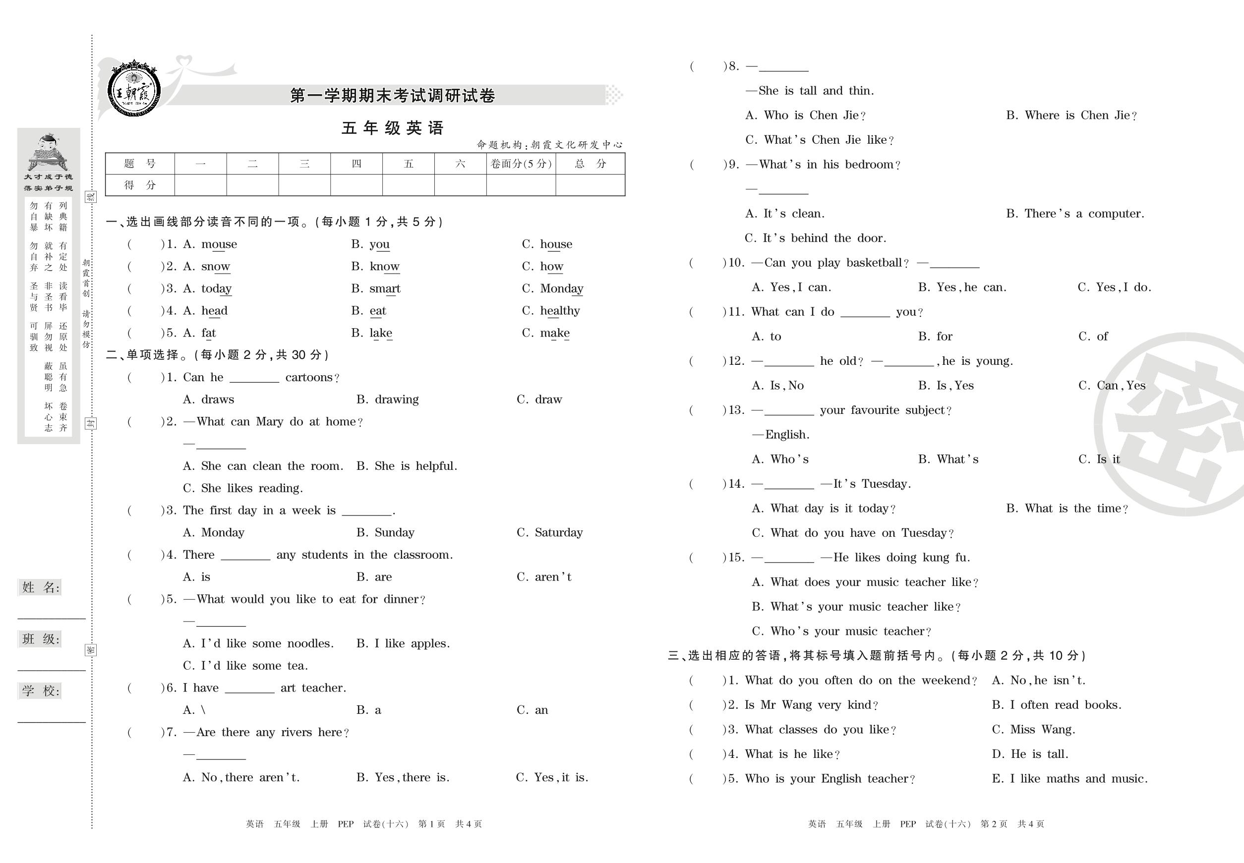 王朝霞期末调研卷五年级上册英语(PEP版)【16】