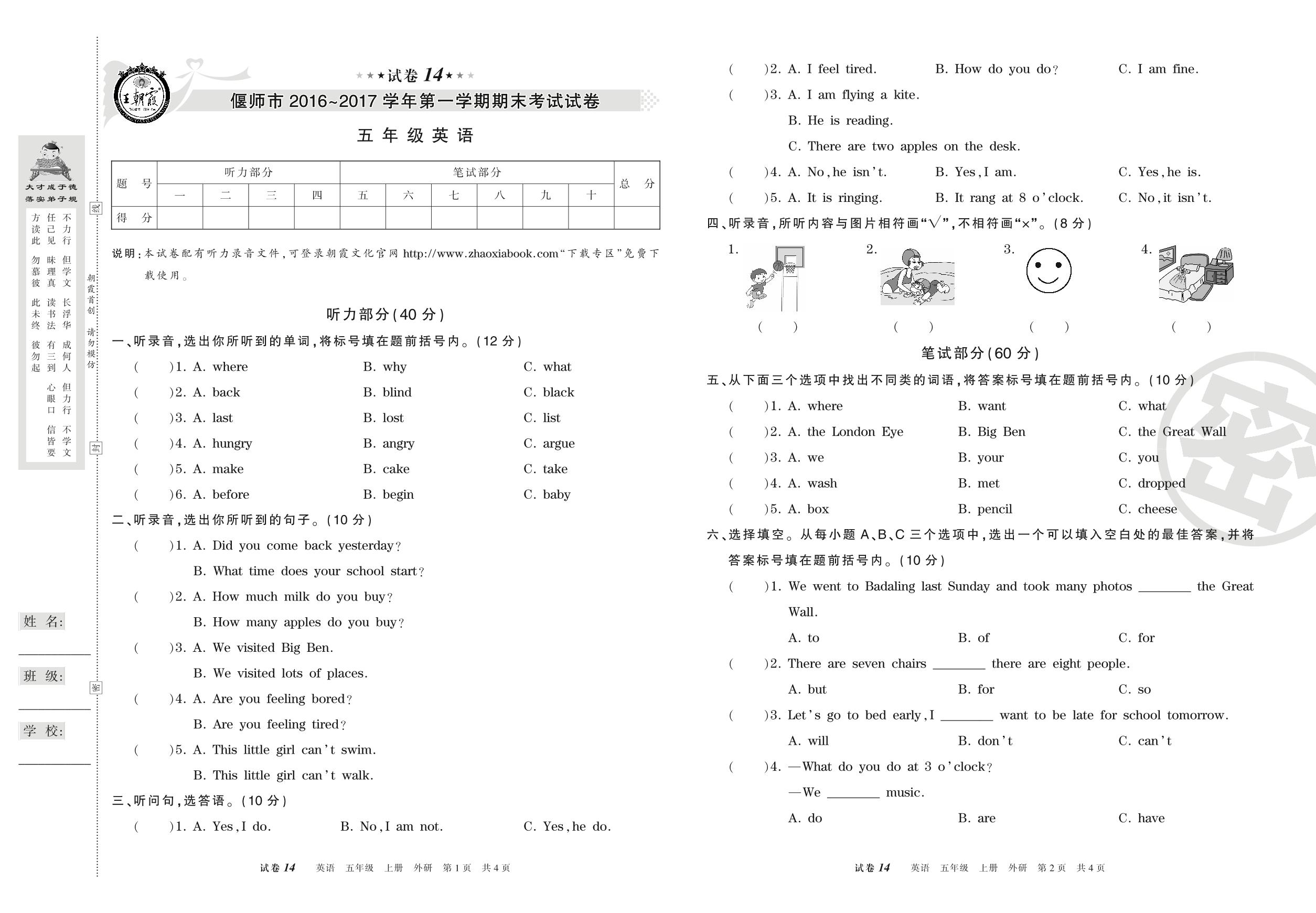 2016-2017学年第一学期偃师市五年级英语试卷(外研版)【14】