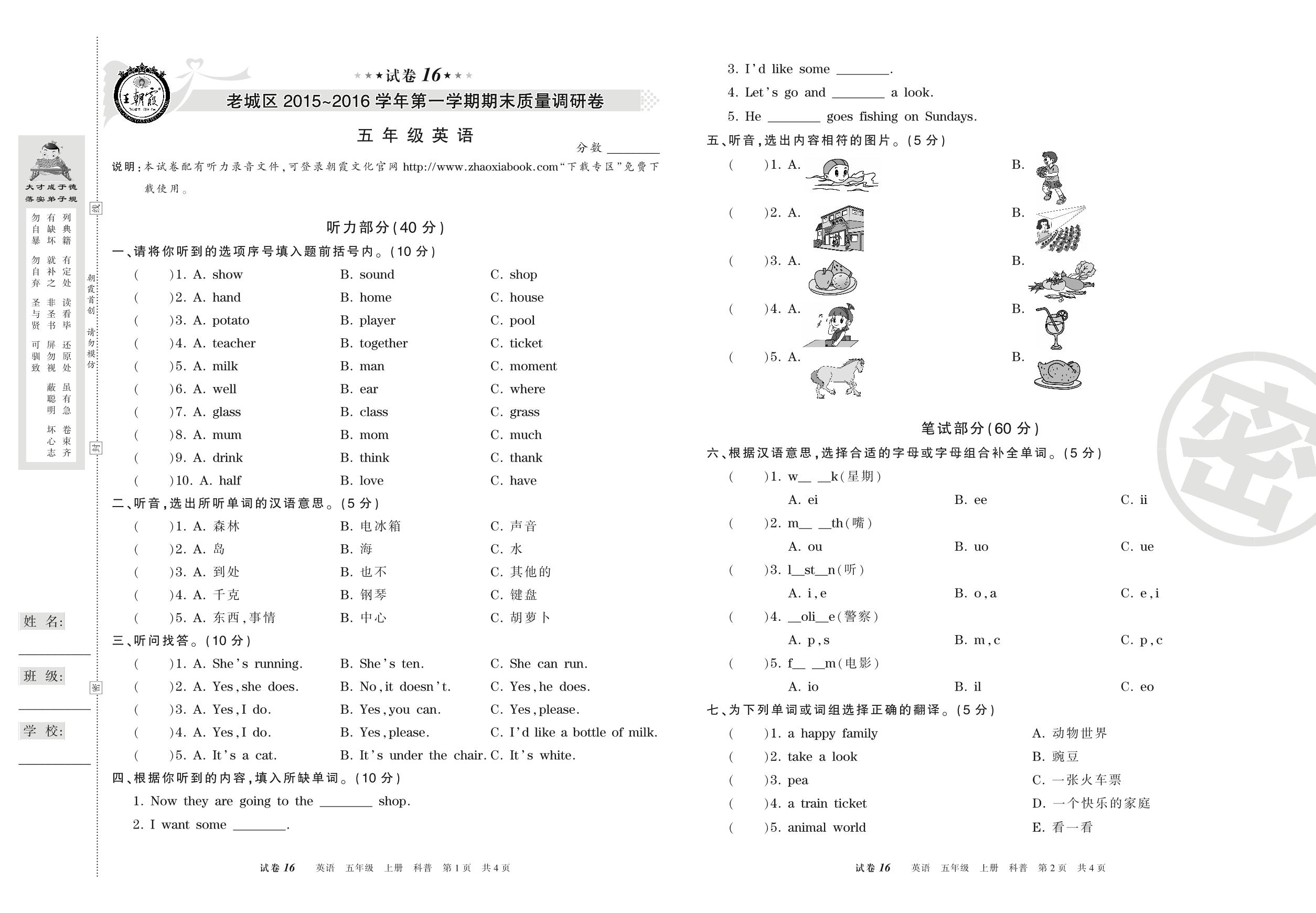 2015-2016学年第一学期洛阳市老城区五年级英语试卷(科普版)【16】