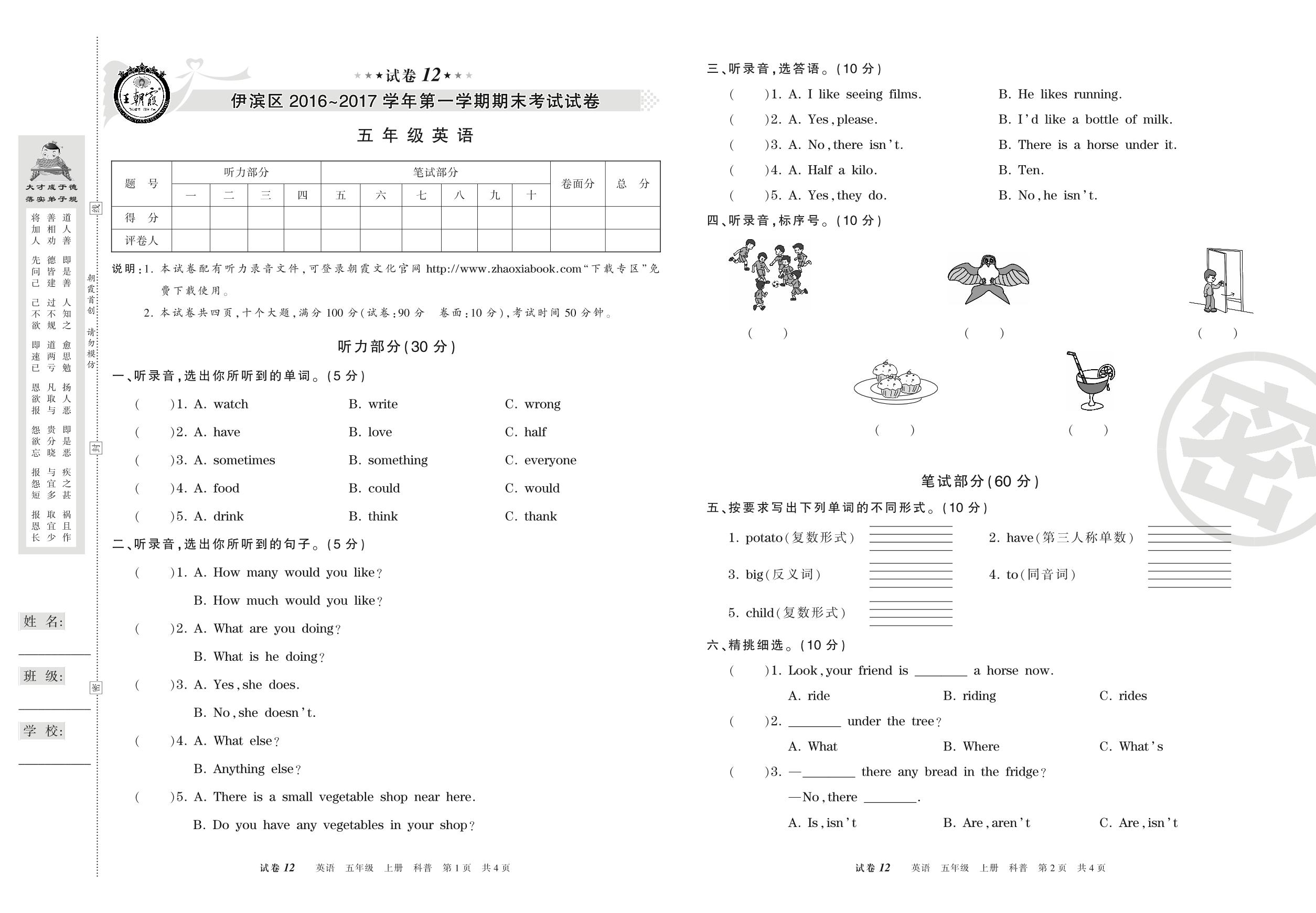2016-2017学年第一学期洛阳市伊滨区五年级英语试卷(科普版)【12】