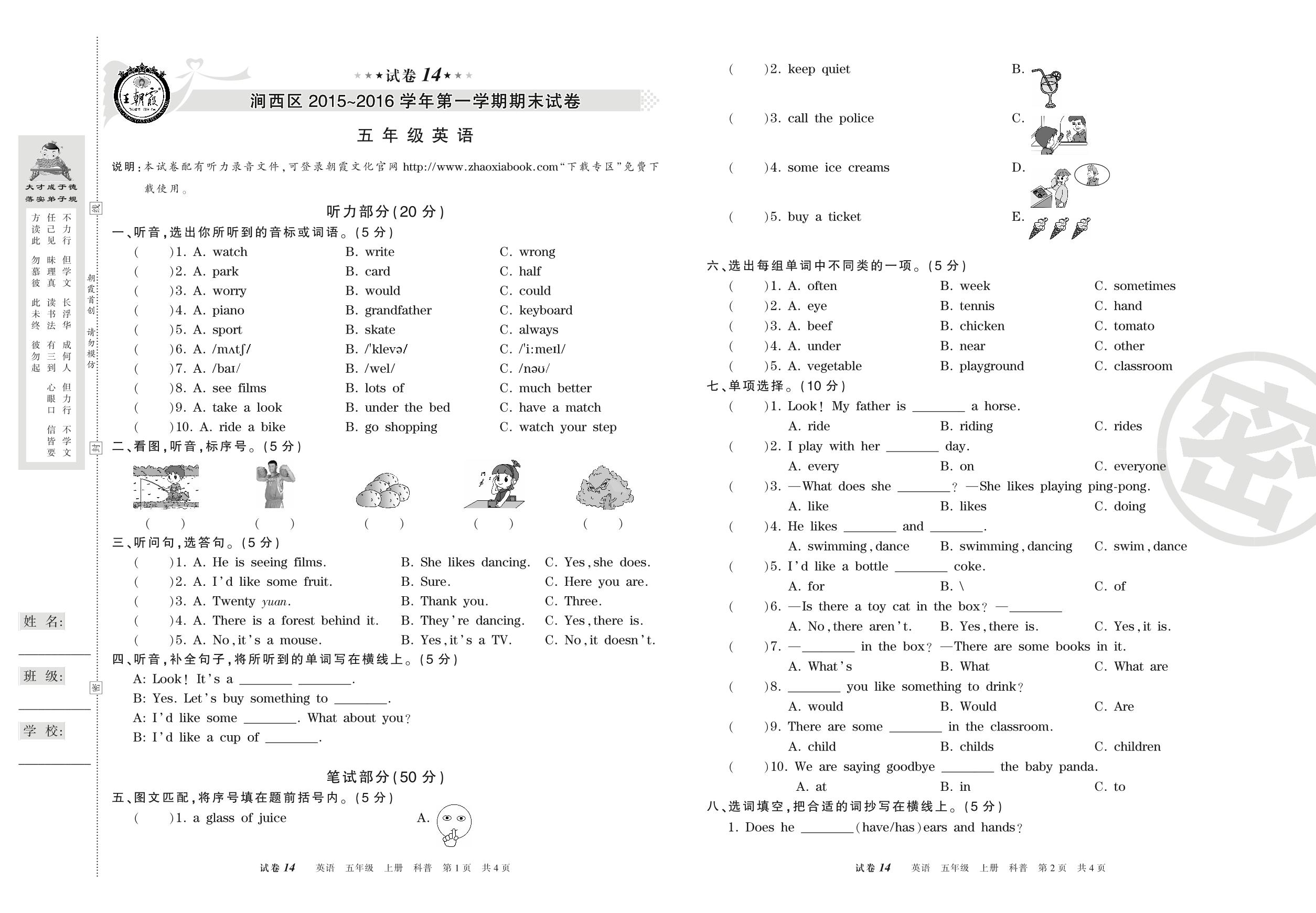 2015-2016学年第一学期洛阳市涧西区五年级英语试卷(科普版)【14】