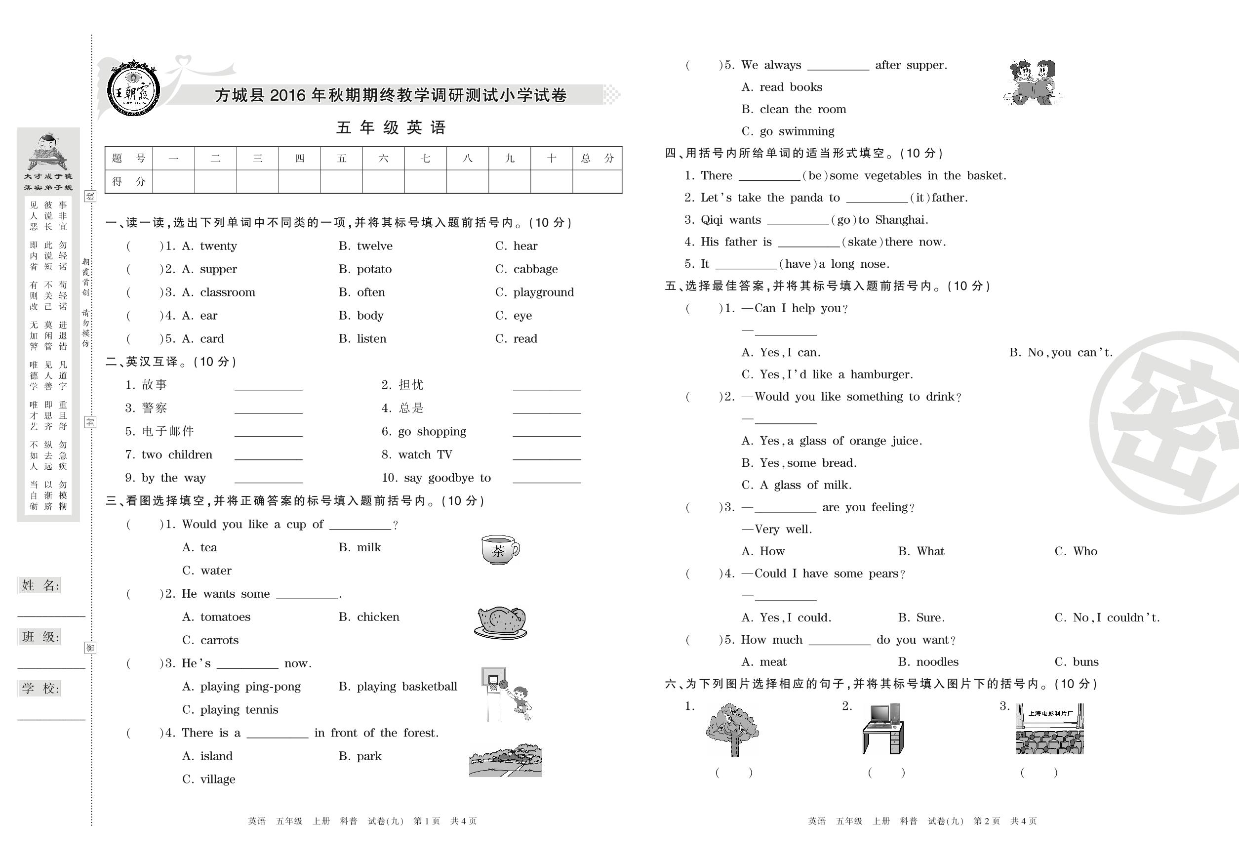 2016-2017学年第一学期南阳市方城县五年级英语试卷(科普版)【9】