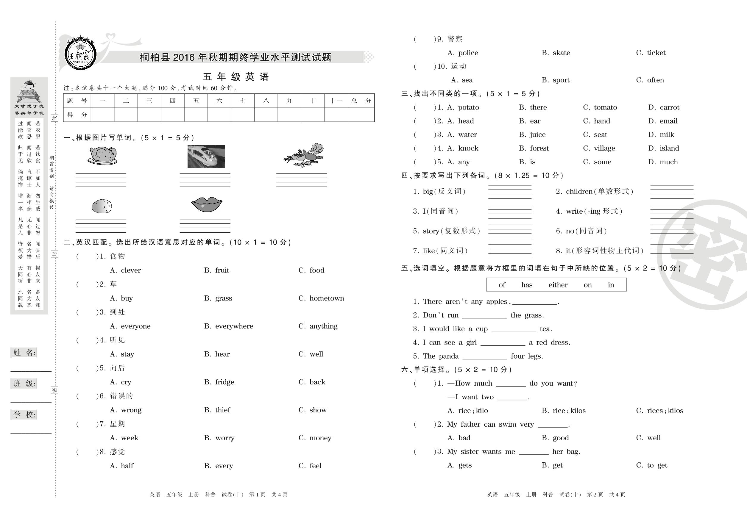 2016-2017学年第一学期南阳市桐柏县五年级英语试卷(科普版)【10】