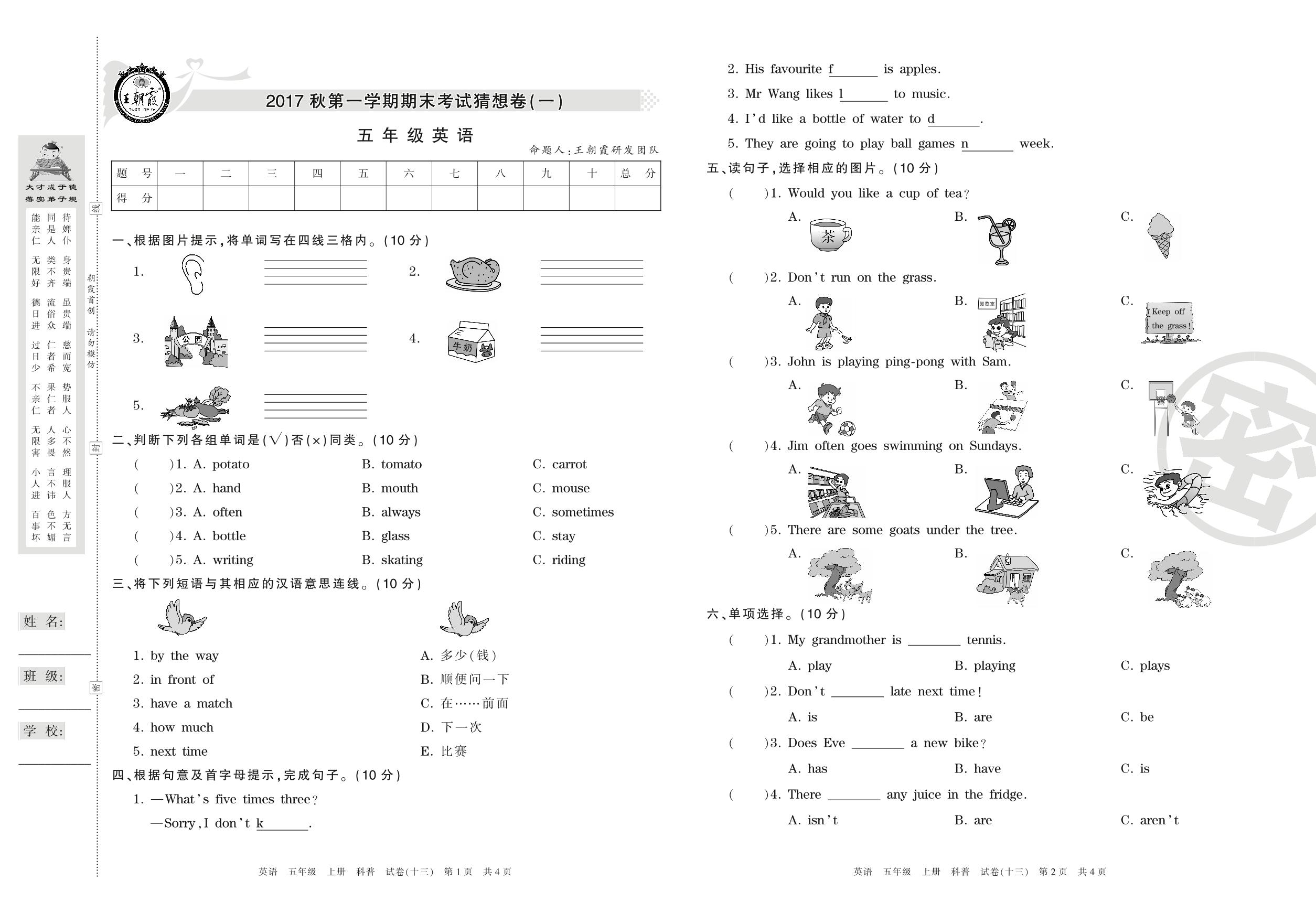 王朝霞期末猜想卷五年级上册英语(科普版)【13】