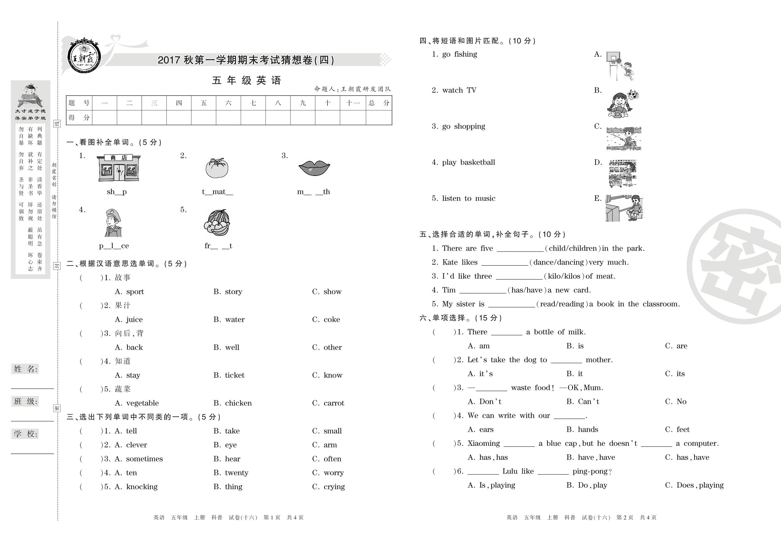 王朝霞期末猜想卷五年级上册英语(科普版)【16】