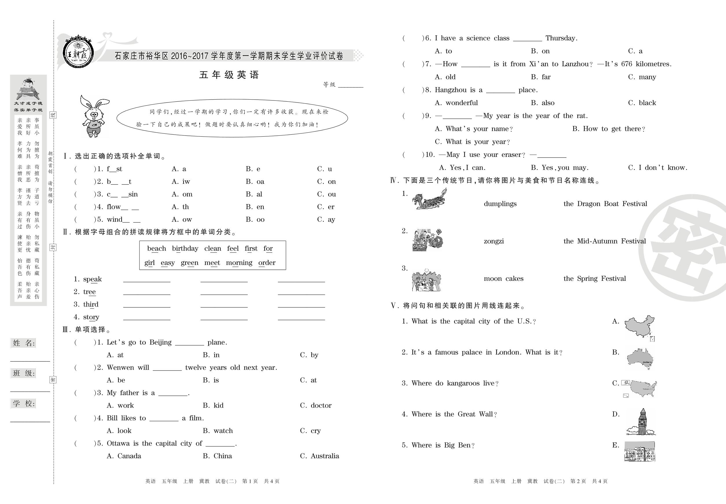 2016-2017学年第一学期石家庄市裕华区五年级英语试卷(冀教版)【2】