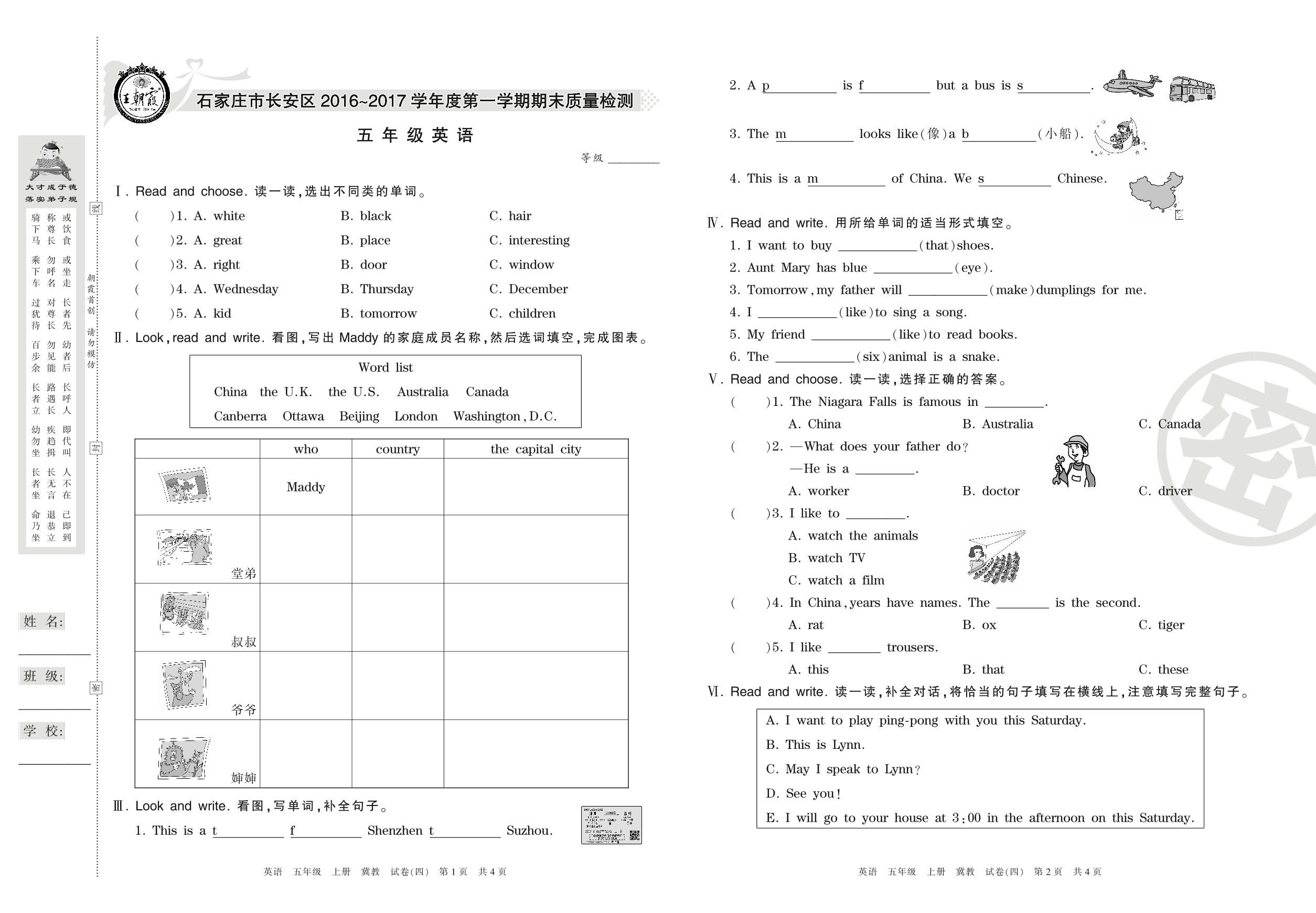 2016-2017学年第一学期石家庄市长安区五年级英语试卷(冀教版)【4】