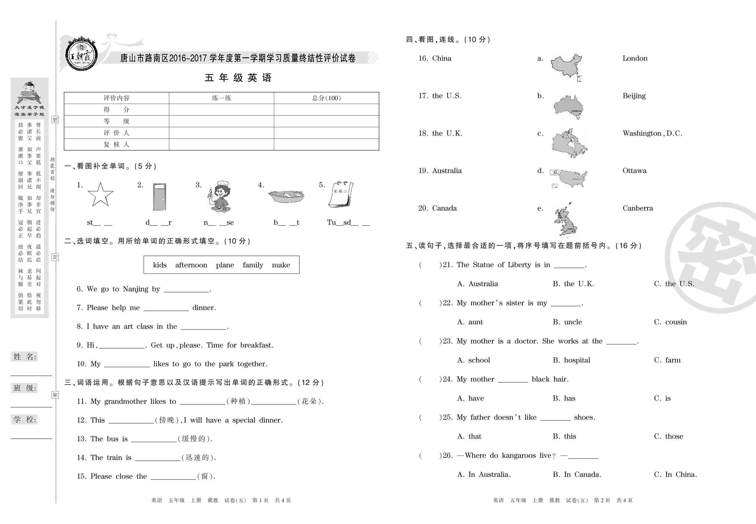 2016-2017学年第一学期唐山市路南区五年级英语试卷(冀教版)【5】