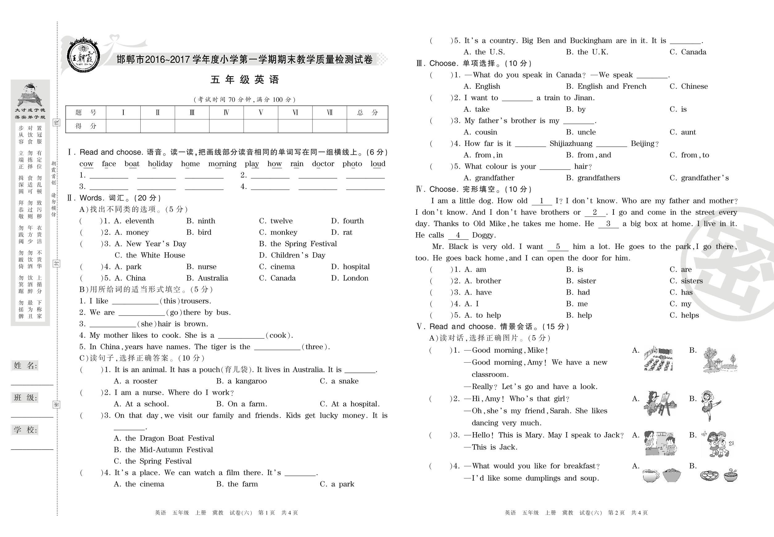 2016-2017学年第一学期邯郸市五年级英语试卷(冀教版)【6】