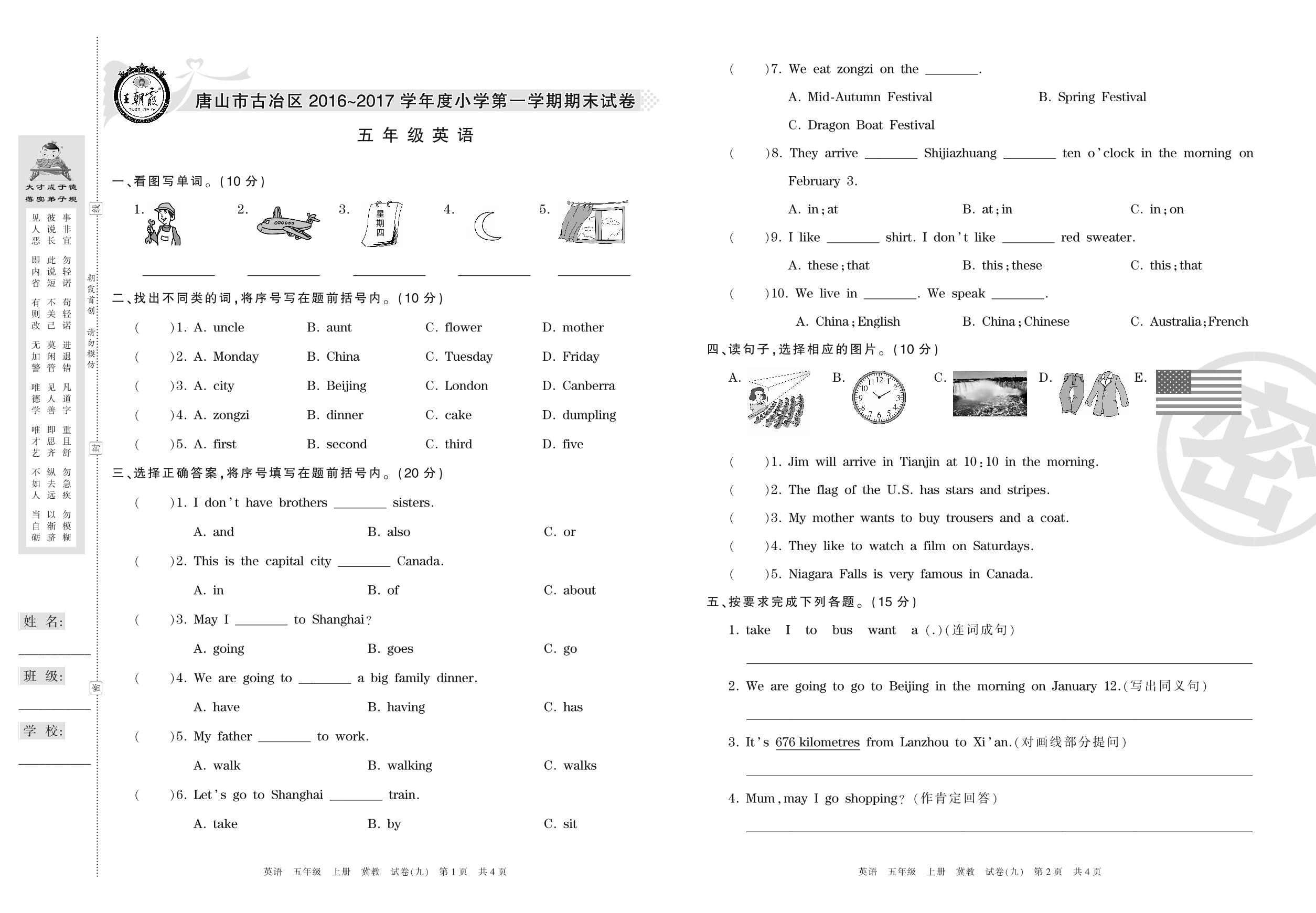 2016-2017学年第一学期唐山市古冶区五年级英语试卷(冀教版)【9】