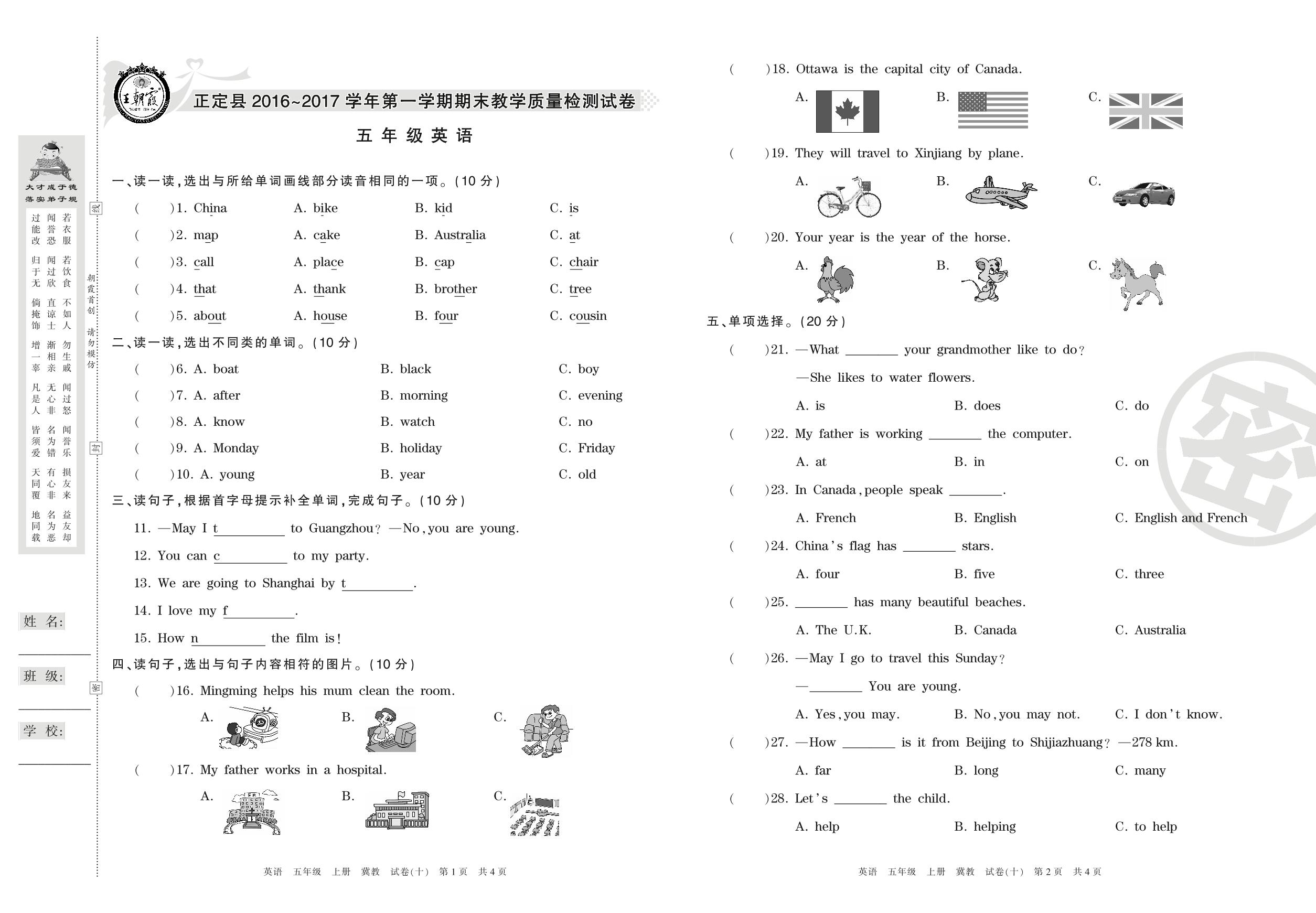 2016-2017学年第一学期石家庄市正定县五年级英语试卷(冀教版)【10】