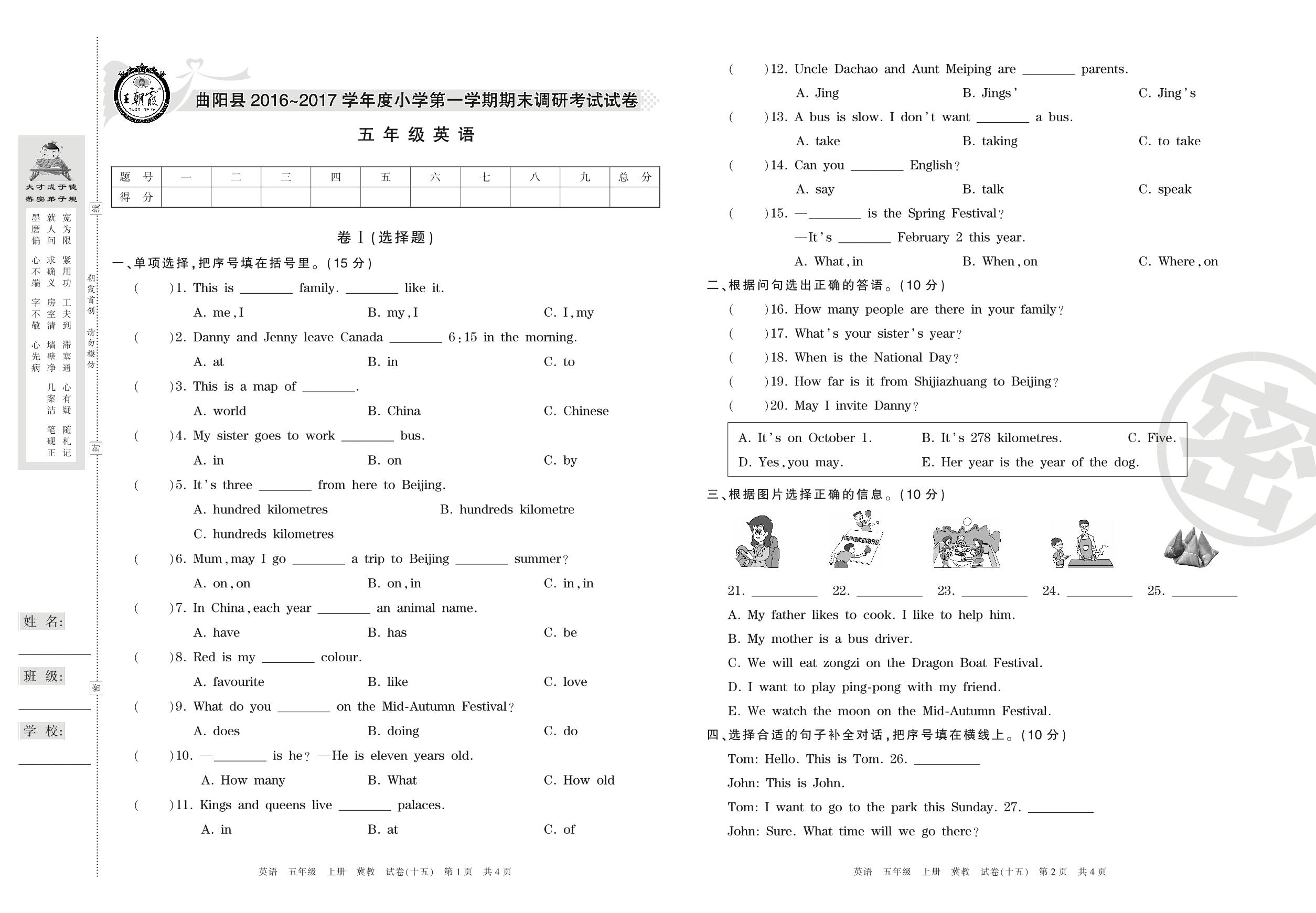 2016-2017学年第一学期保定市曲阳县五年级英语试卷(冀教版)【15】