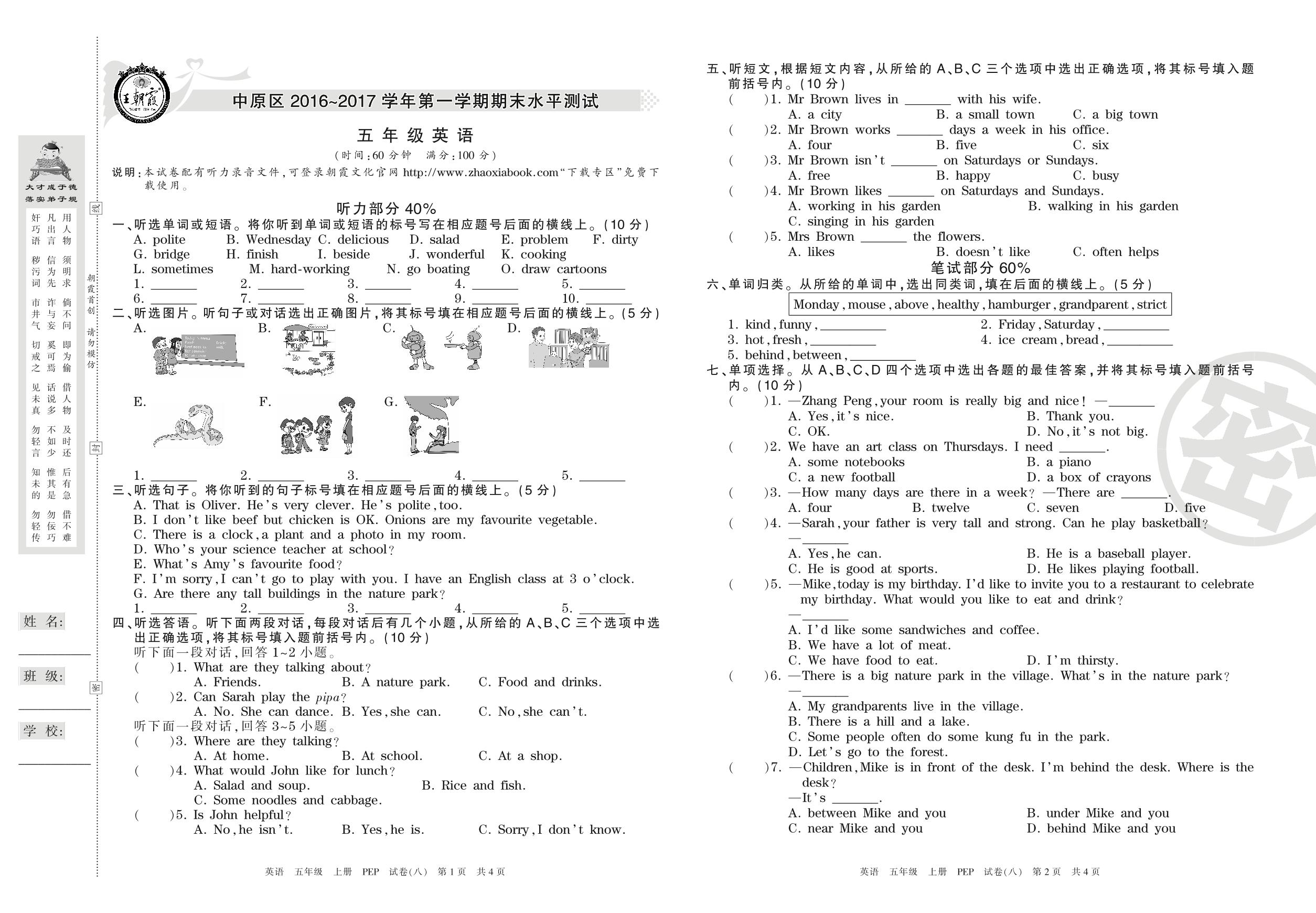 2016-2017学年第一学期郑州市中原区五年级英语试卷(PEP版)【8】
