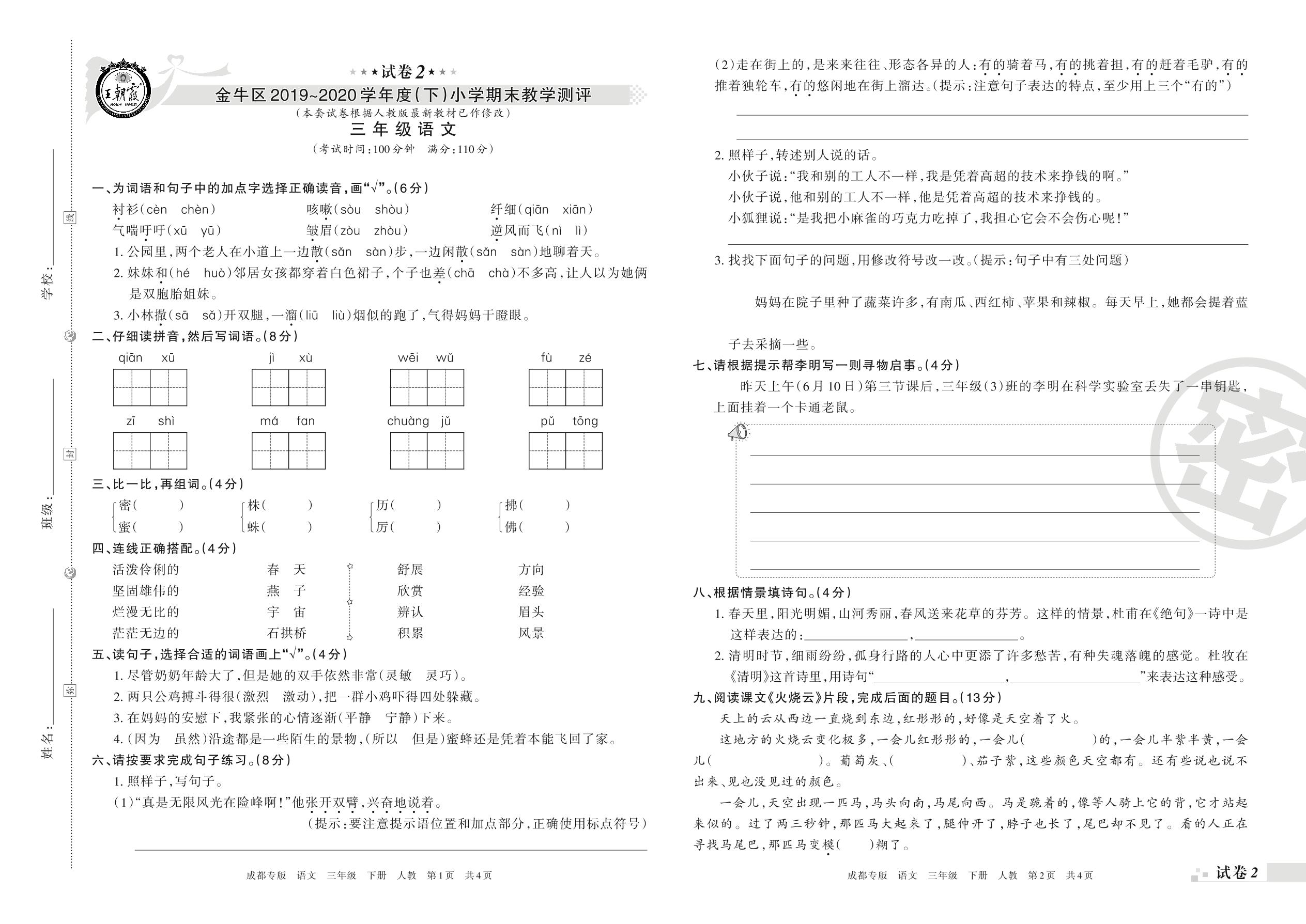 2019-2020学年第二学期成都市金牛区三年级语文试卷(人教版)【2】