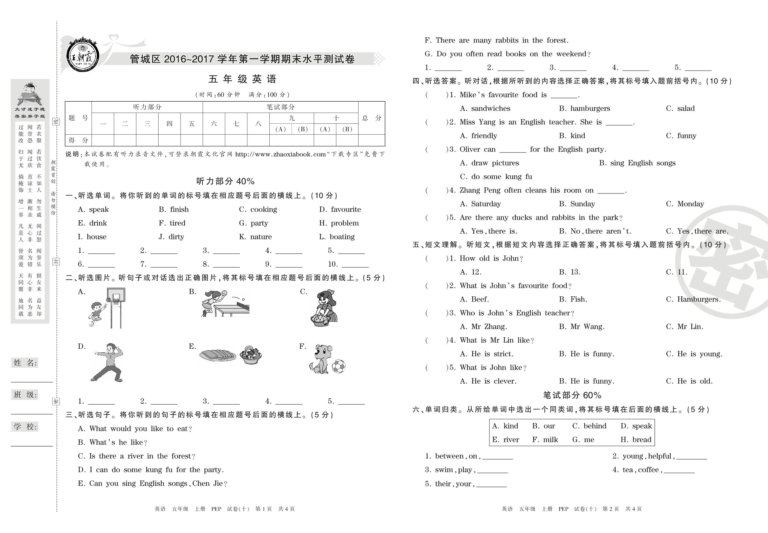 2016-2017学年第一学期郑州市管城区五年级英语试卷(PEP版)【10】