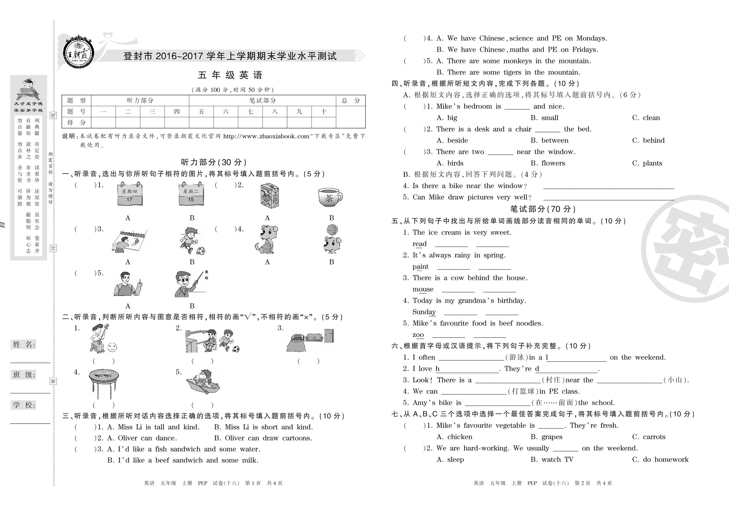 2016-2017学年第一学期登封市五年级英语试卷(PEP版)【16】