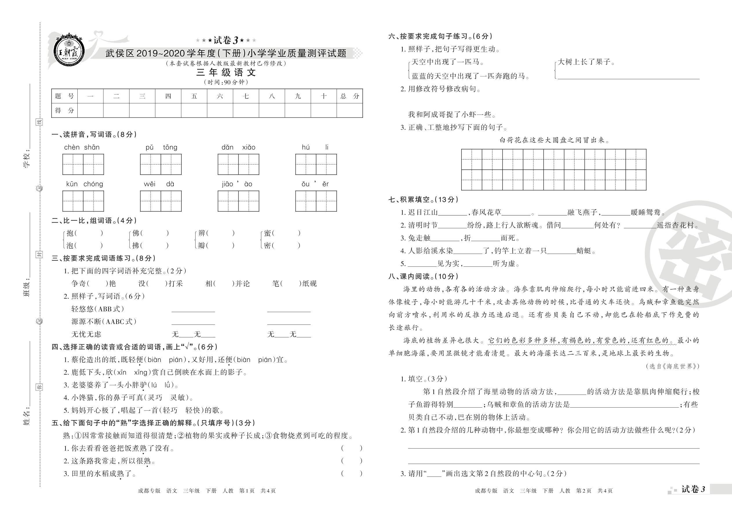 2019-2020学年第二学期成都市武侯区三年级语文试卷(人教版)【3】