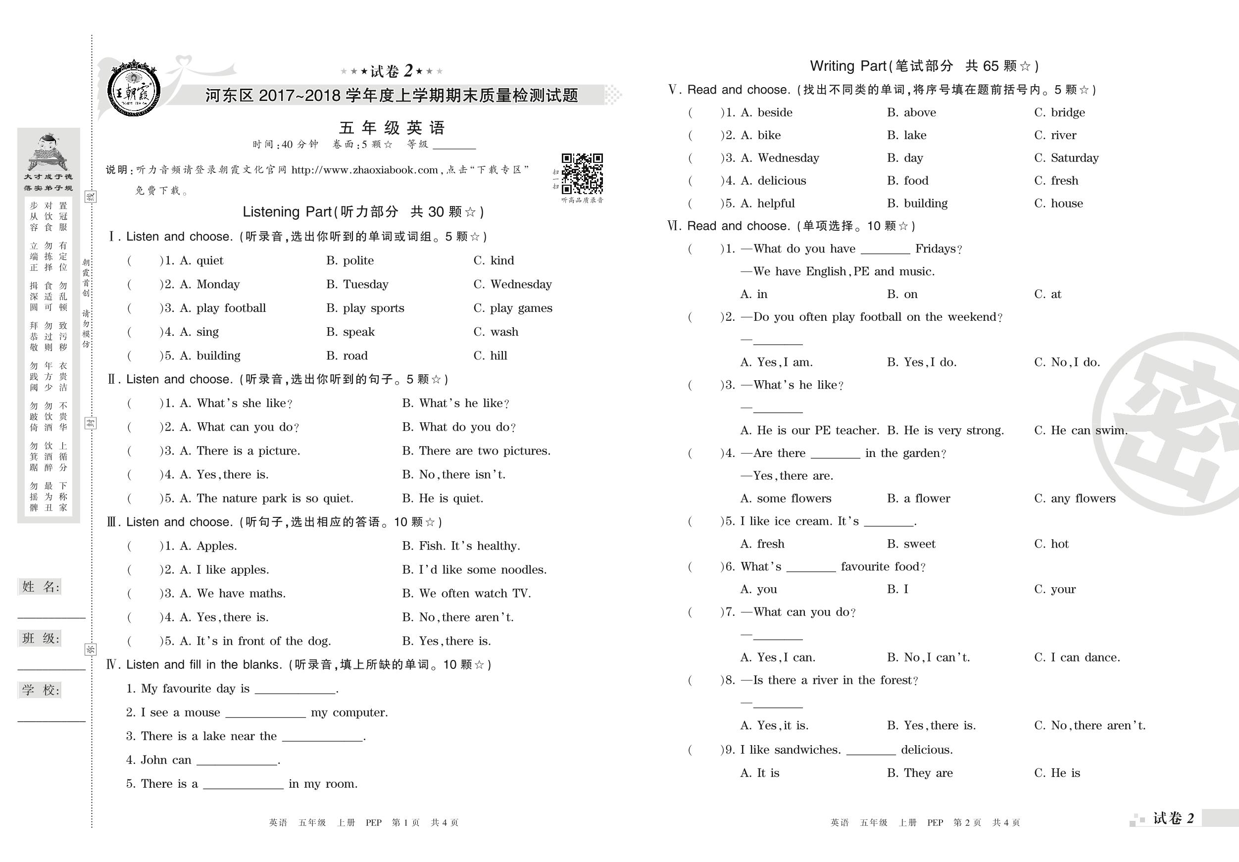 2017-2018学年第一学期临沂市河东区五年级英语试卷(PEP版)【2】