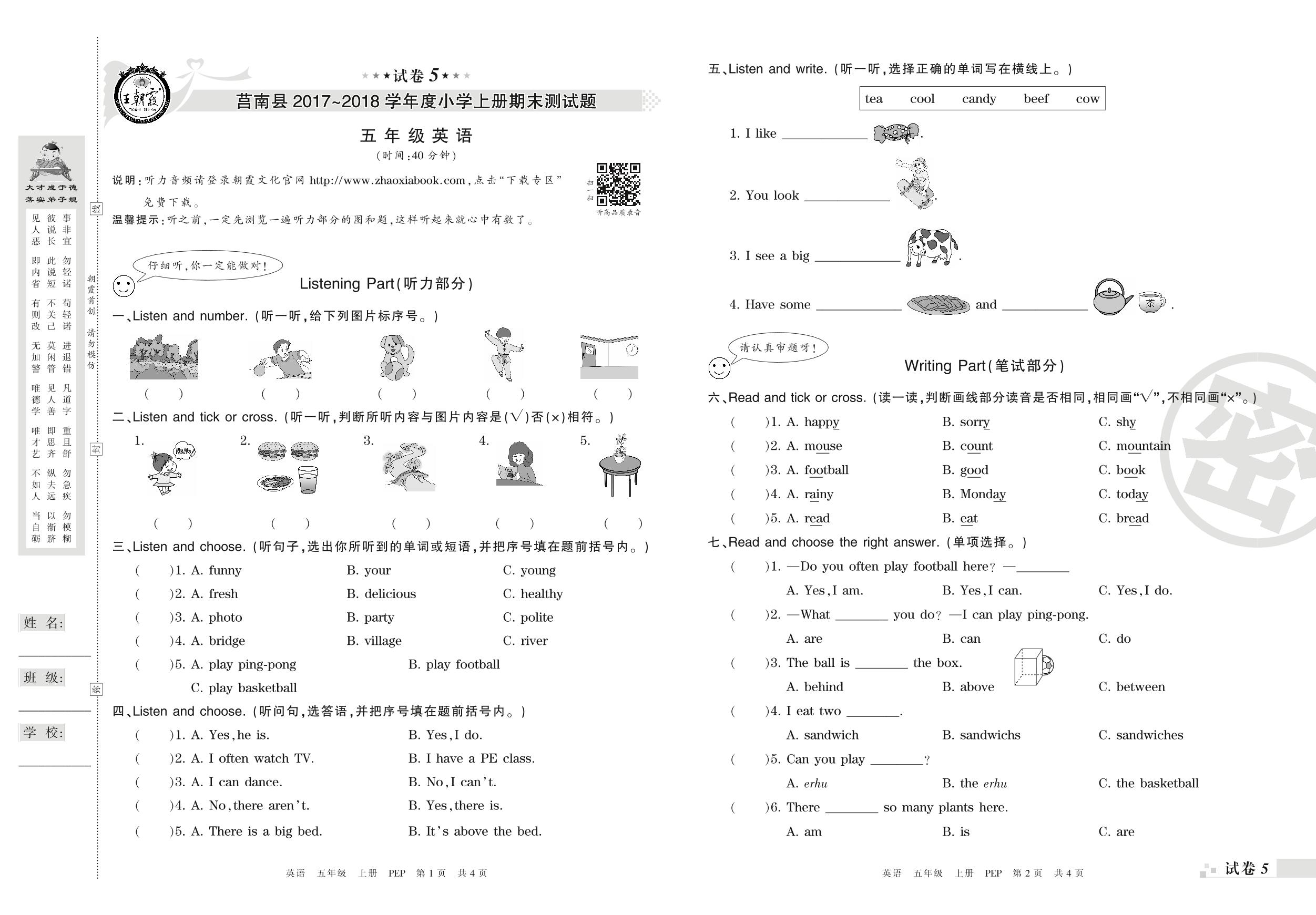2017-2018学年第一学期临沂市莒南县五年级英语试卷(PEP版)【5】